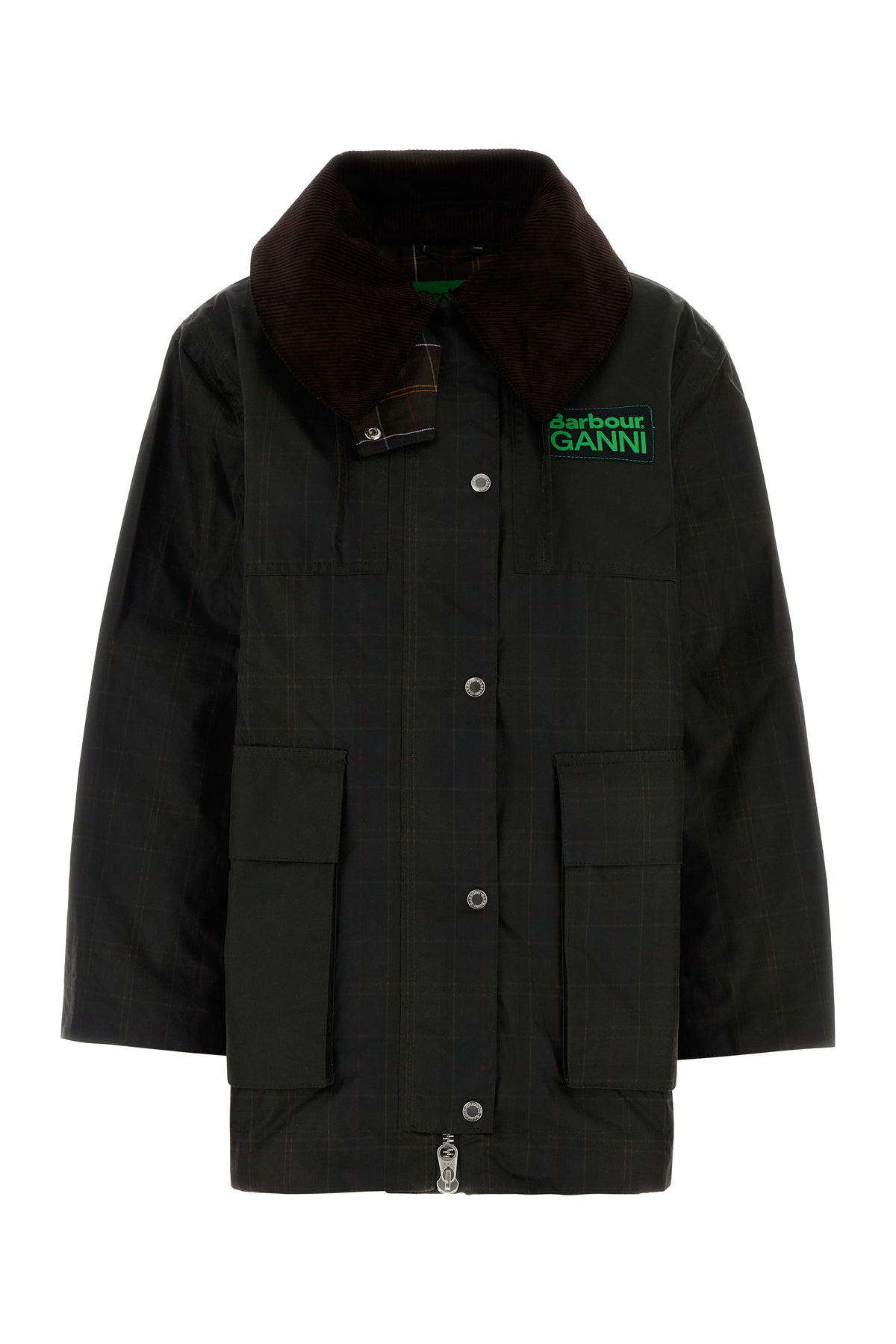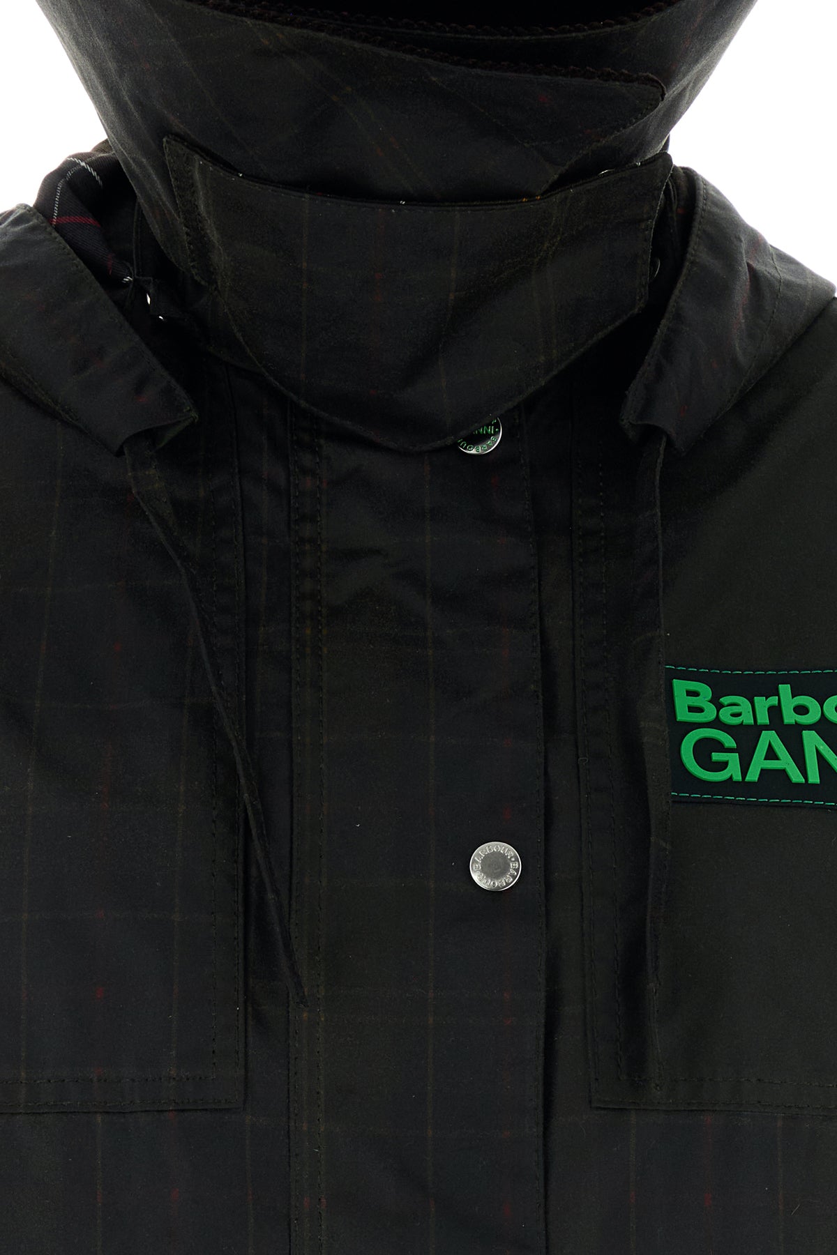 Giubbino realizzato in puro cotone rivestito caratterizzato da stampa tartan su tutta la superficie arricchito da applicazione Barbour Ganni sul petto.