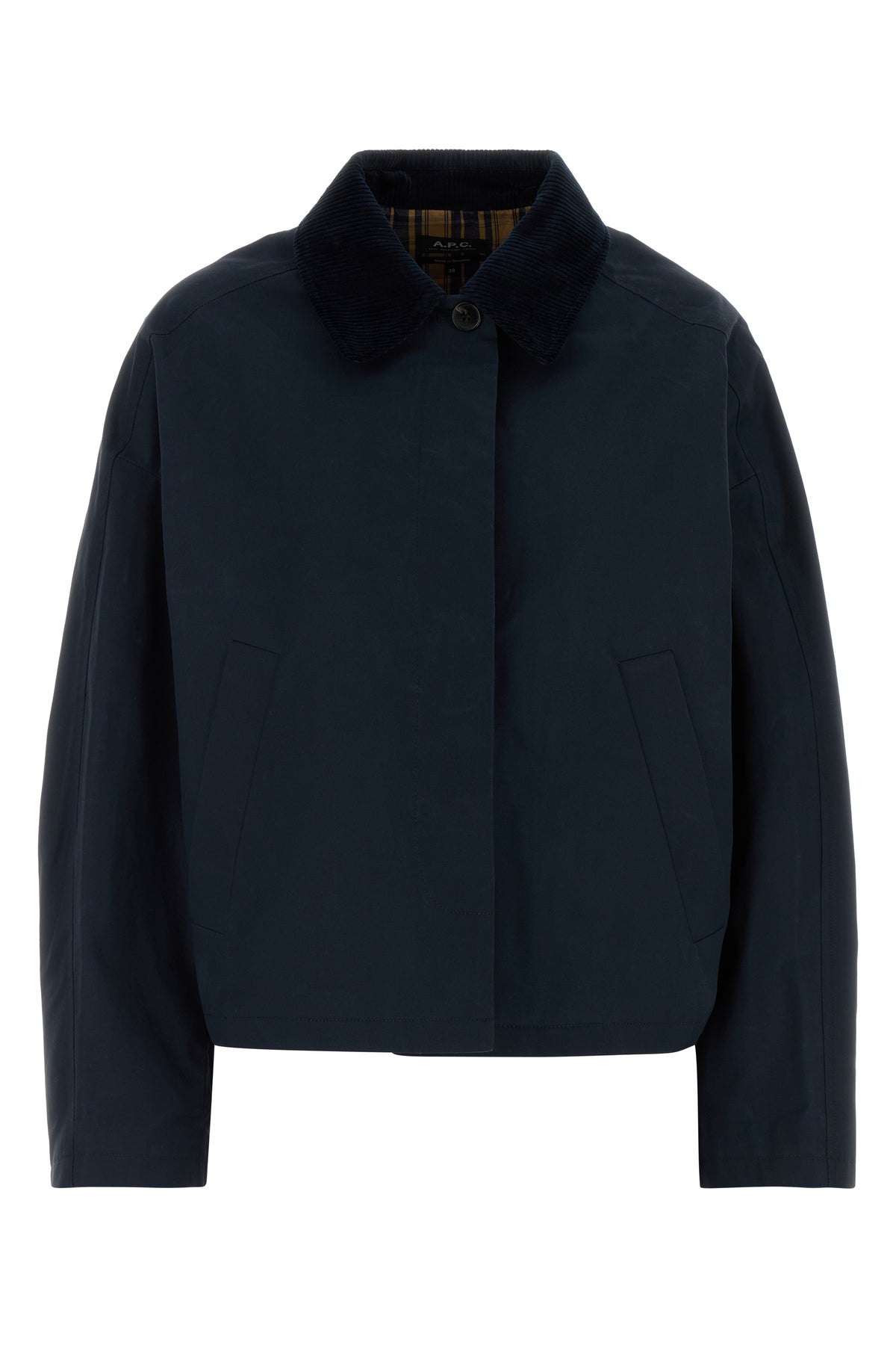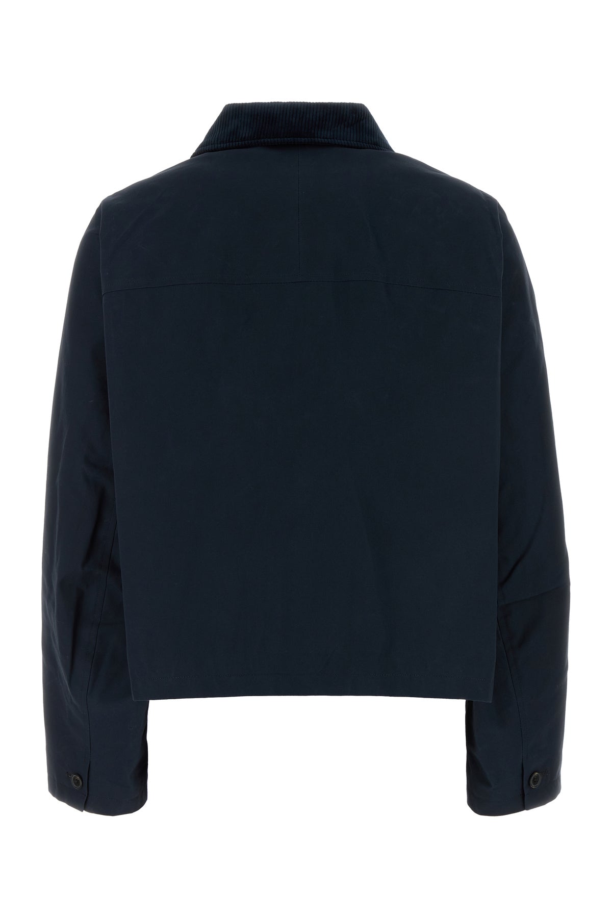 Giubbino realizzato in puro cotone caratterizzato da colletto in velluto a coste a contrasto.
