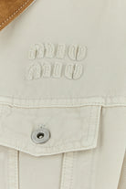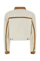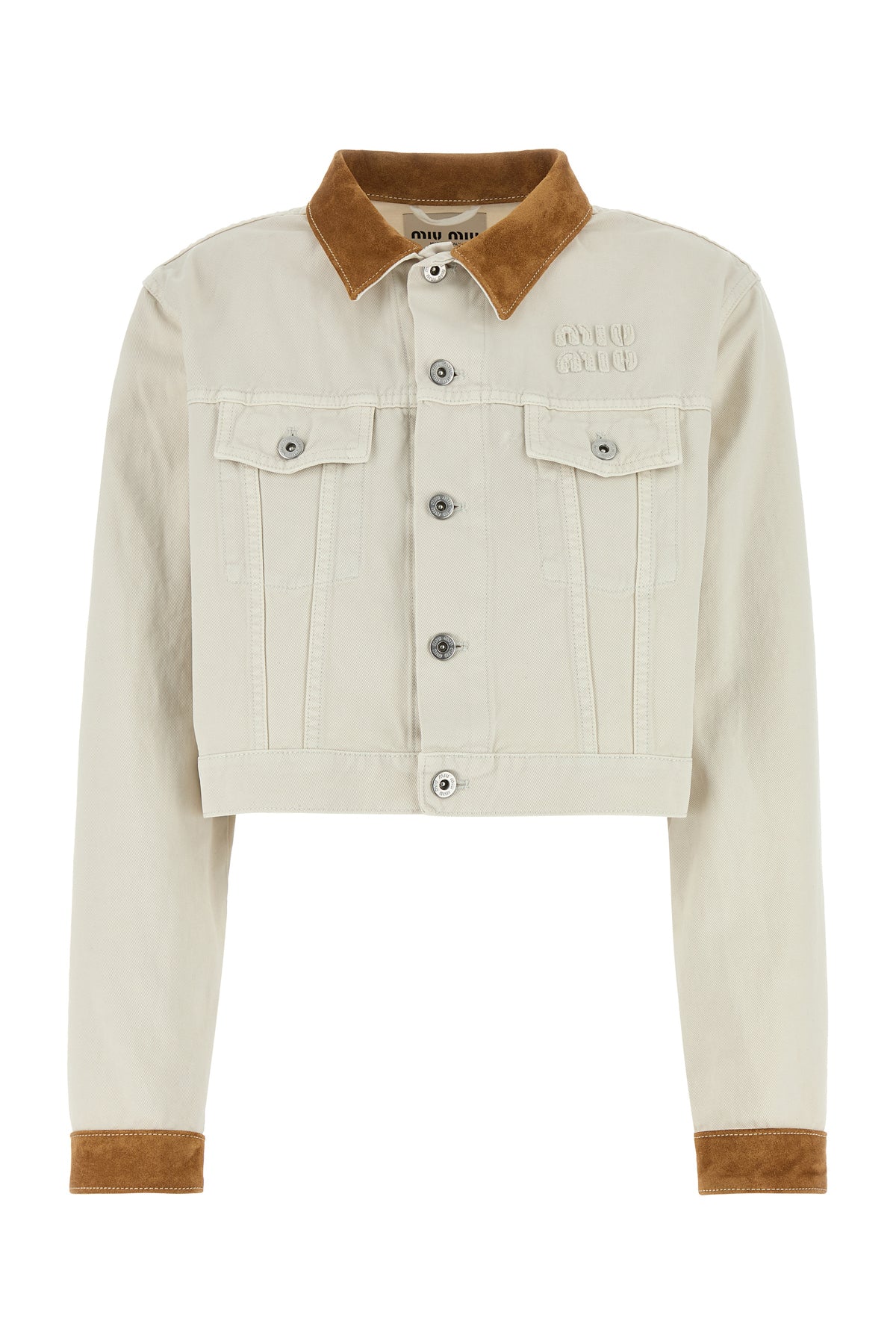 Giubbino realizzato in denim di puro cotone con inserti in pelle scamosciata a contrasto arricchito da applicazione logata in tessuto tonale sul petto.