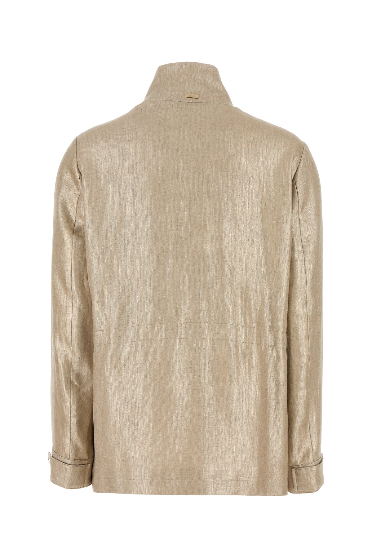 Giubbino realizzato in puro lino rivestito ad effetto laminato arricchito da targhetta logata metallica sul retro.