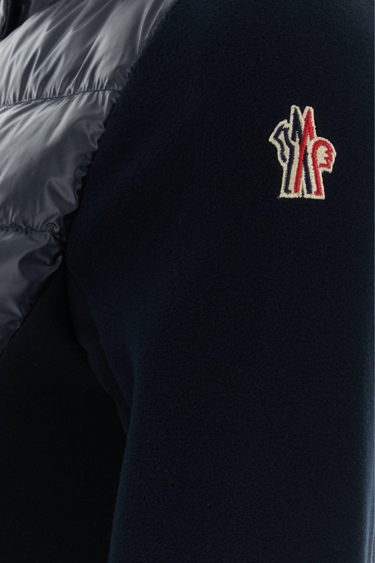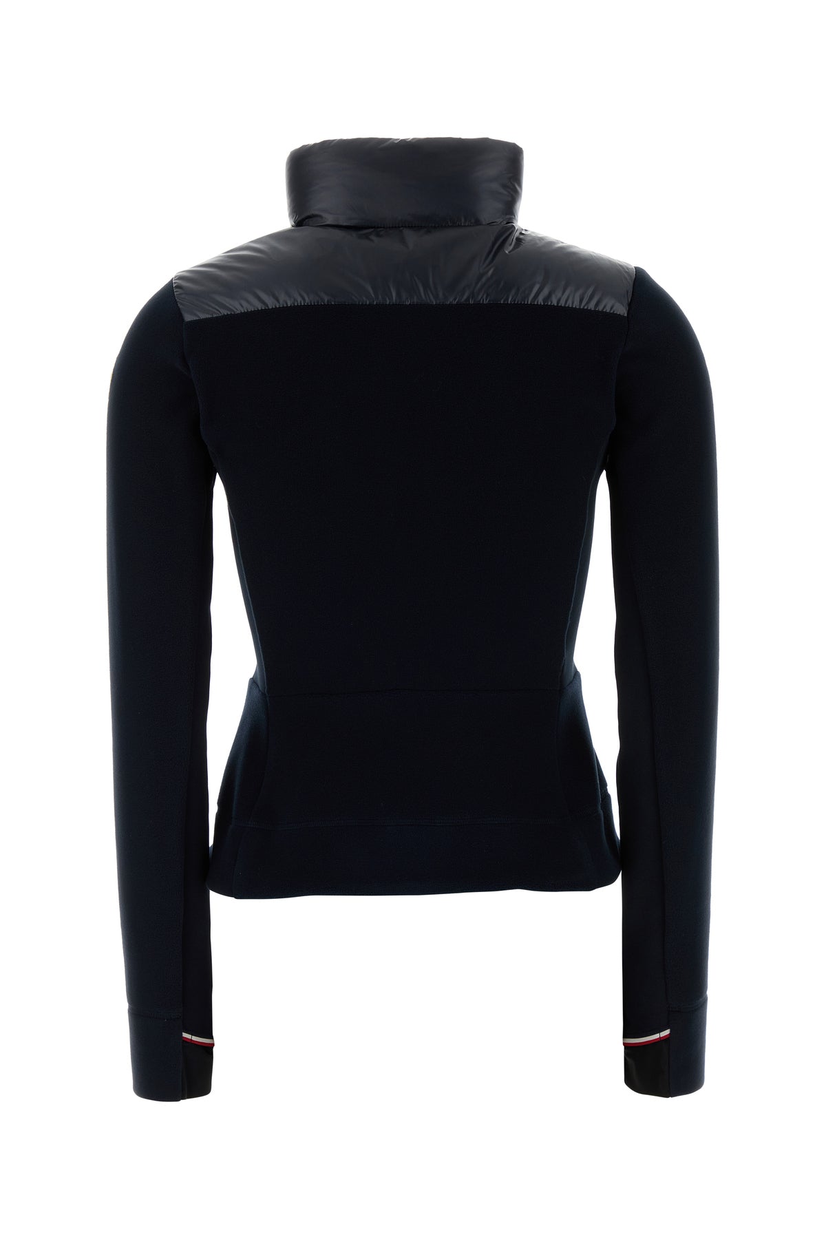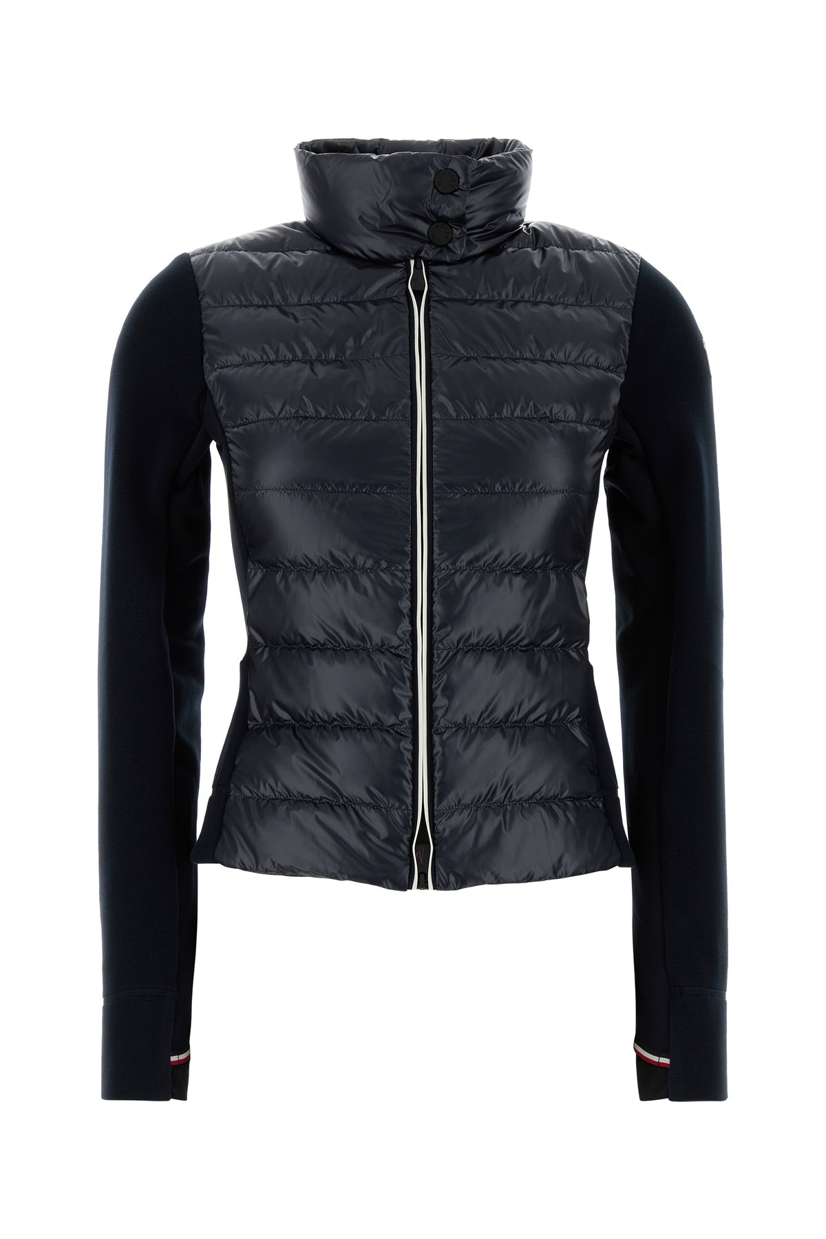 Giubbino realizzato in poliestere stretch con inserto in poliestere trapuntato sulla parte frontale arricchito da applicazione logata sulla manica.