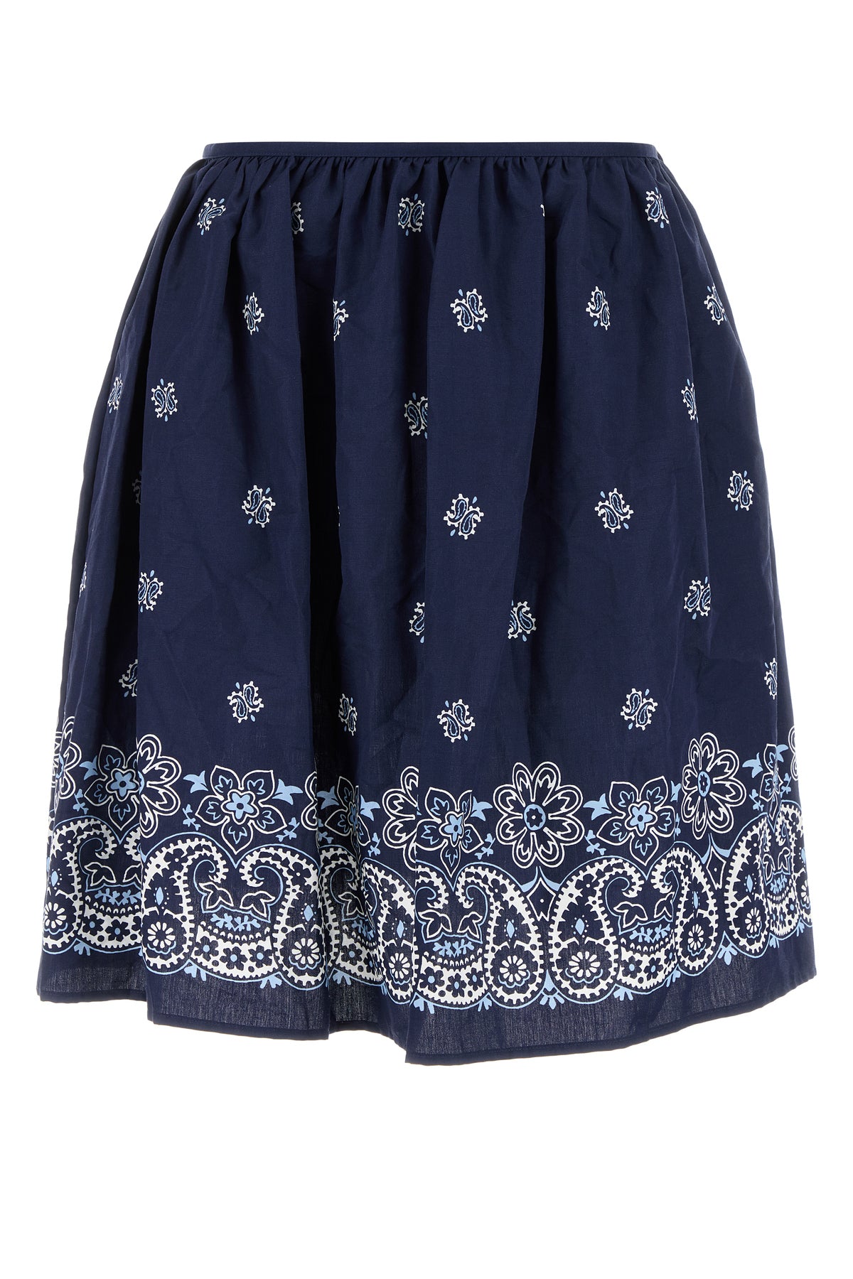 Gonna realizzata in popeline di cotone e lino caratterizzata da stampa Fiordaliso su tutta la superficie arricchita da etichetta logata sul retro.