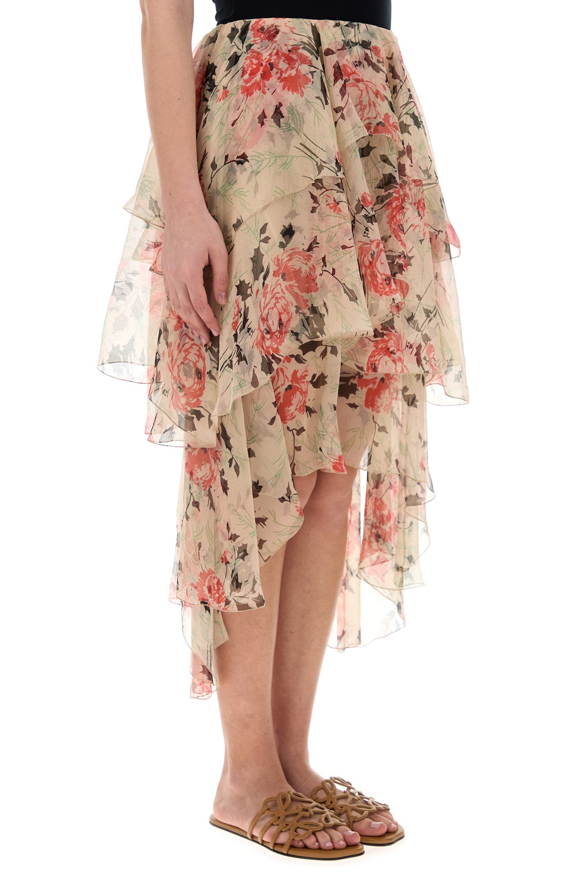 Gonna a balze realizzata in pura seta caratterizzata da stampa Peony su tutta la superficie.