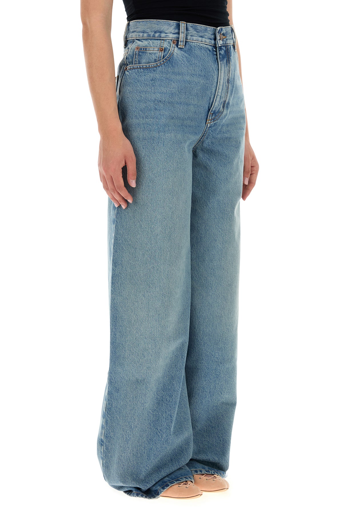 Jeans dalla gamba ampia realizzati in denim di puro cotone slavato arricchito da etichetta logata a contrasto sul retro.