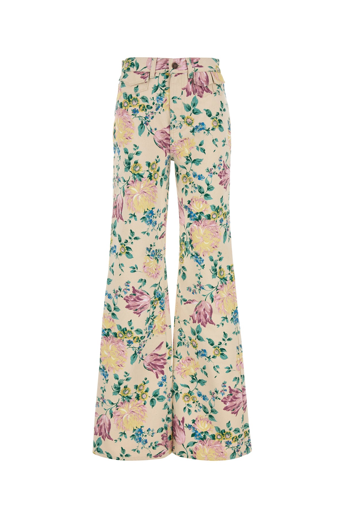 Jeans dalla gamba ampia realizzato in denim di puro cotone caratterizzato da stampa floreale su tutta la superficie.
