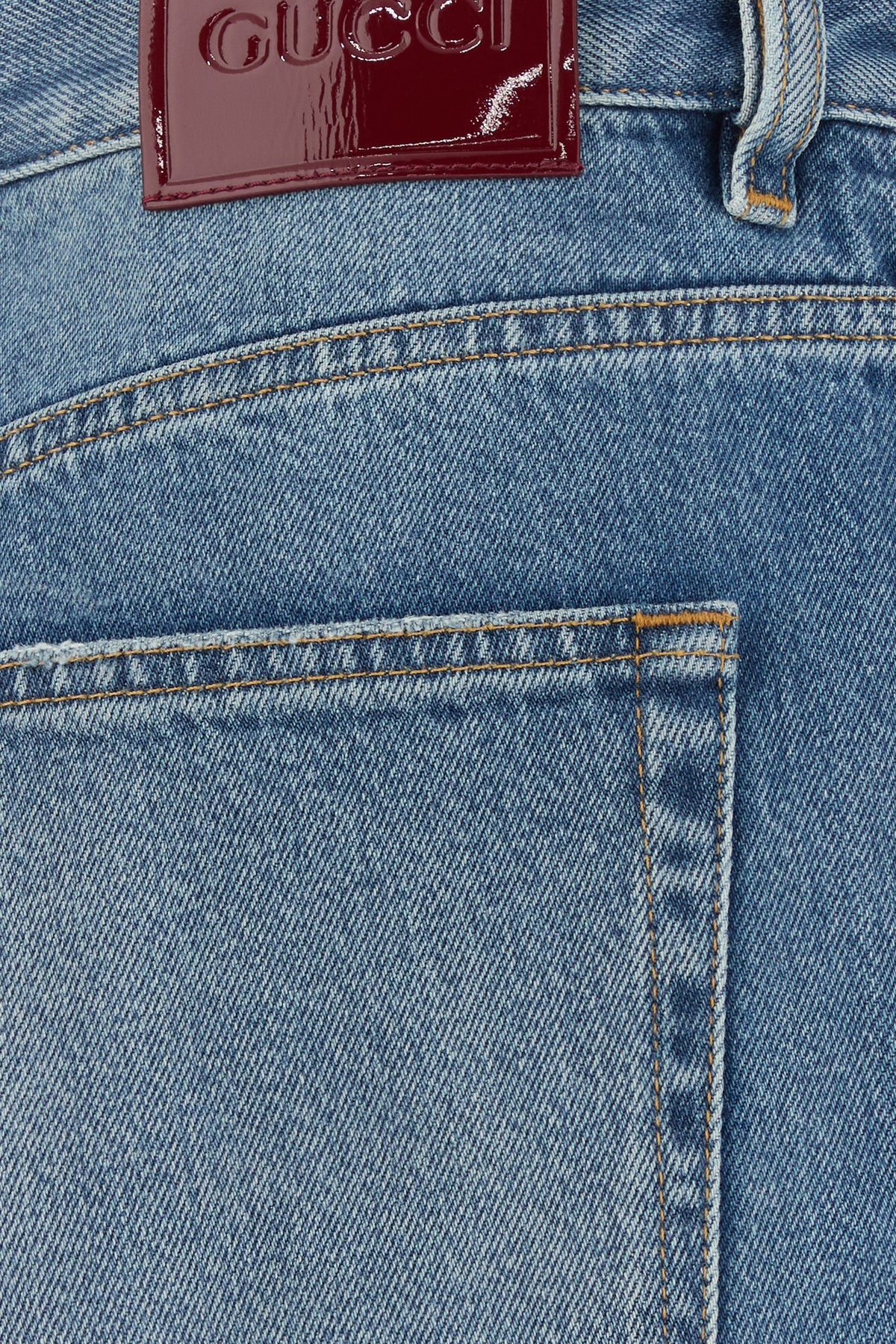 Jeans realizzato in denim di puro cotone slavato arricchito da etichetta logata a contrasto sul retro.