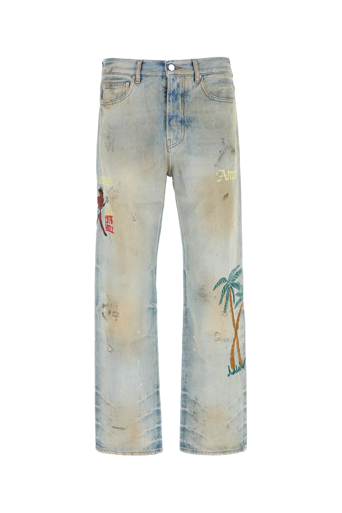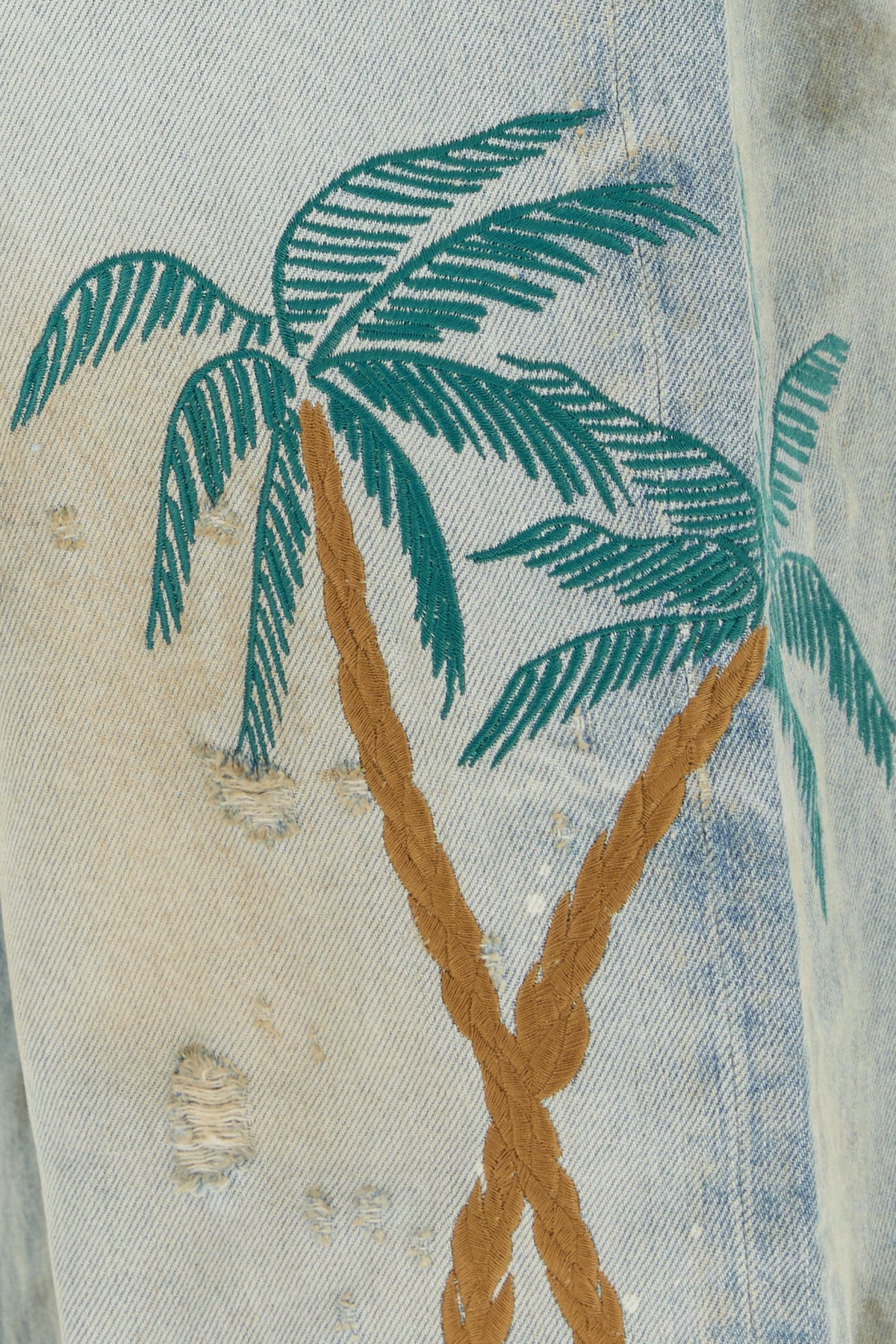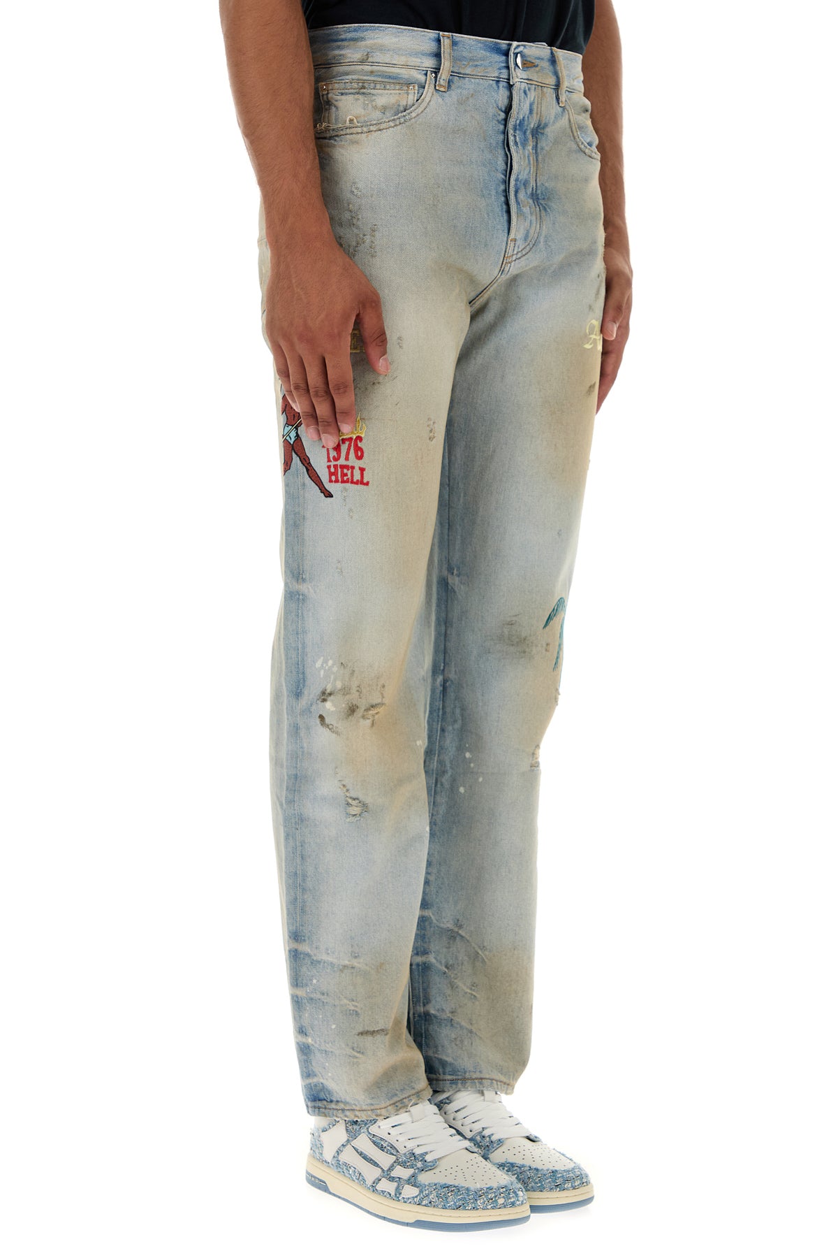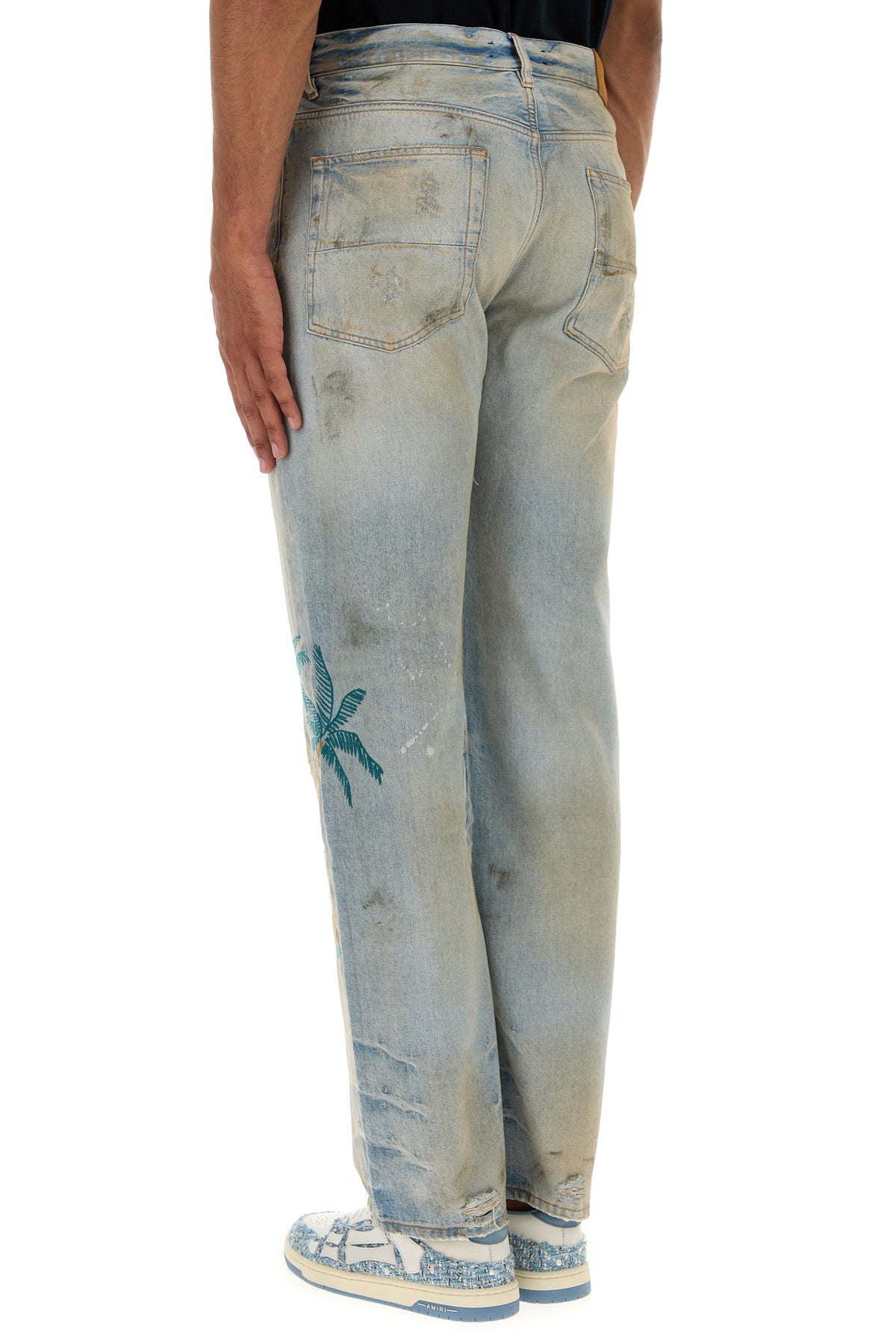 Jeans realizzati in denim di puro cotone slavato e sdrucito caratterizzati da sporcature intenzionali su tutta la superficie e ricami logati sui lati.