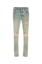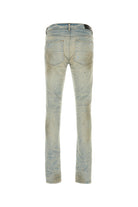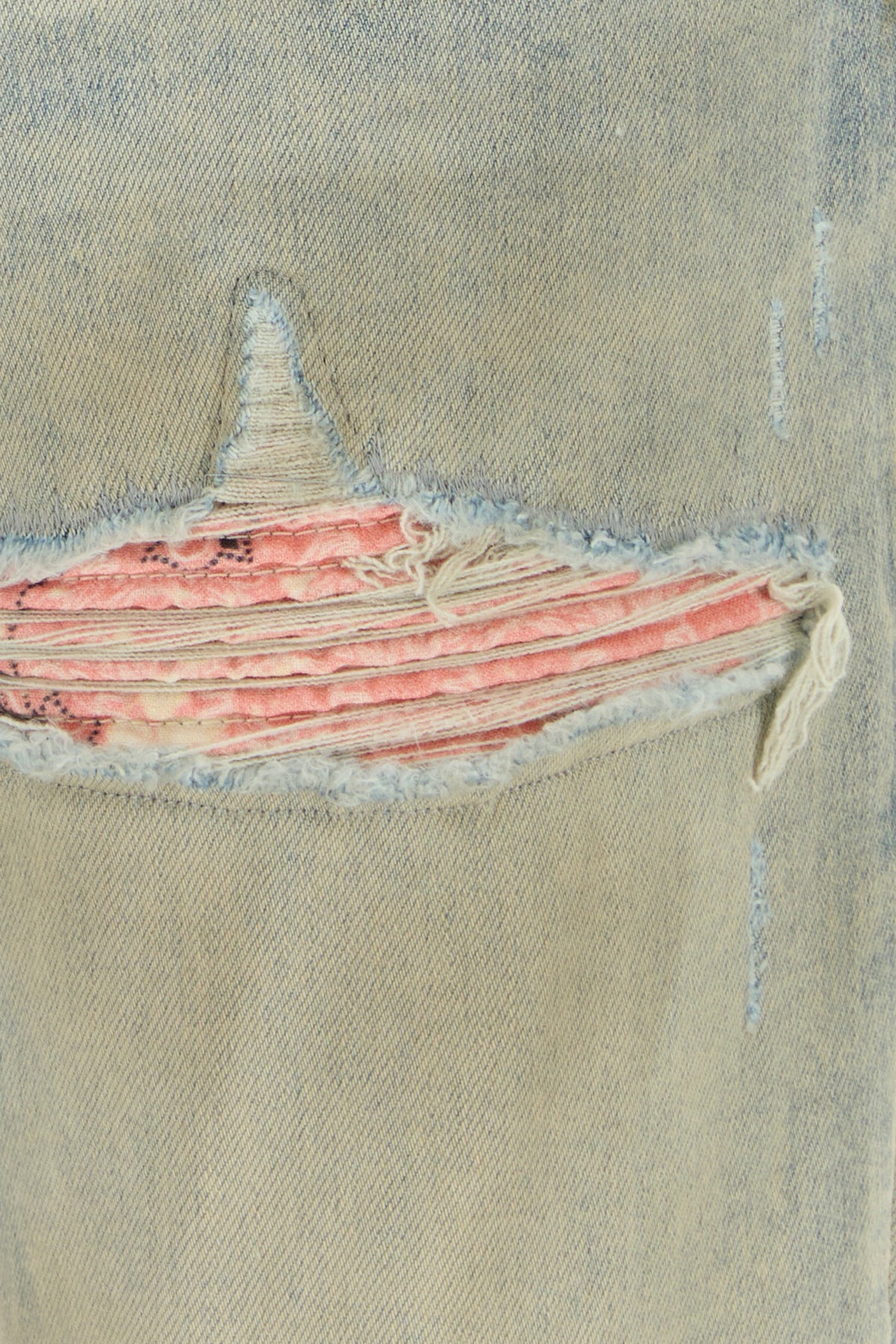 Jeans skinny realizzato in denim di cotone stretch slavato e sdrucito caratterizzato da strappi ricuciti sulla parte frontale.
