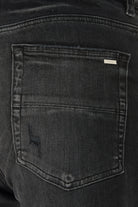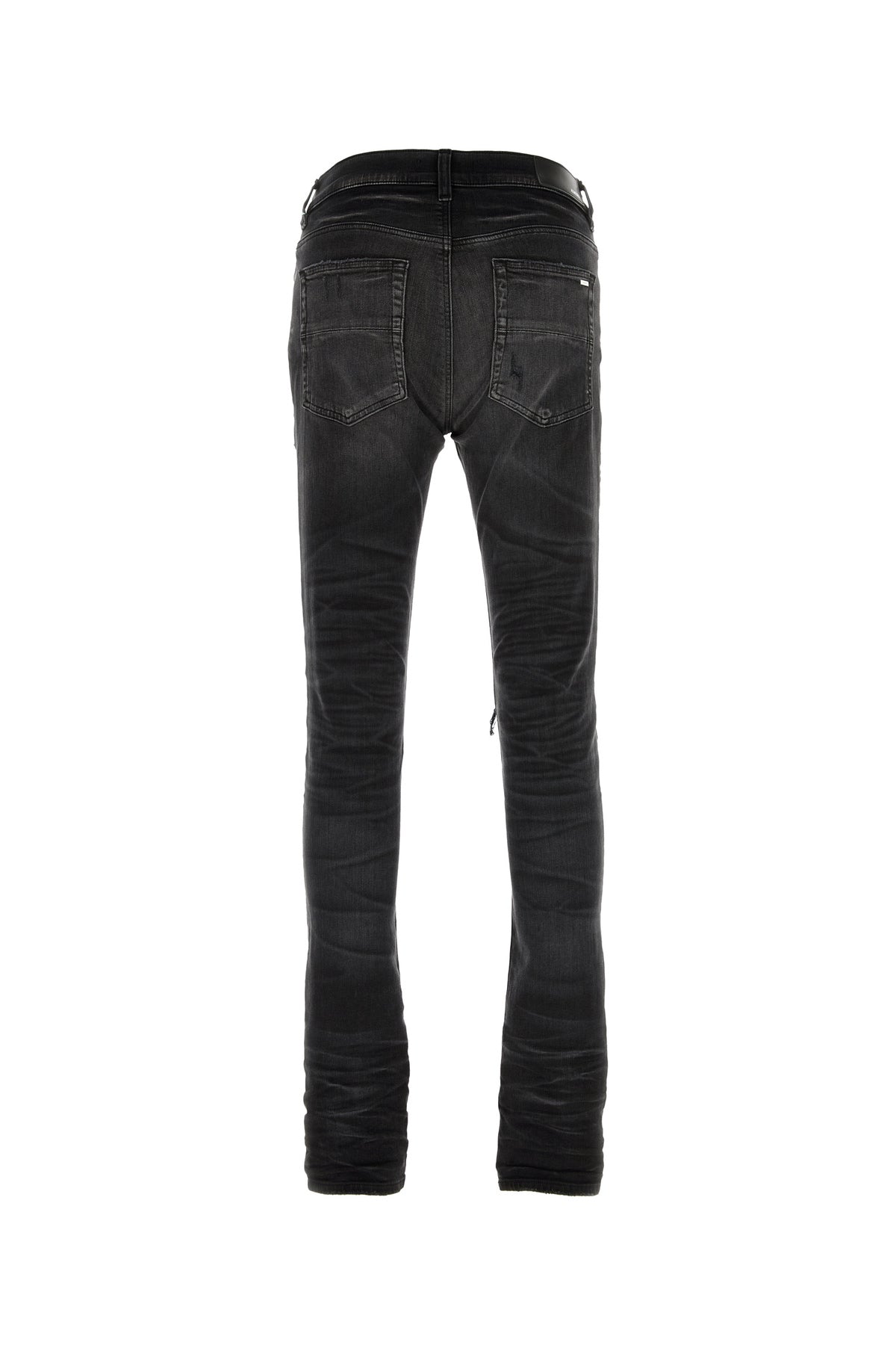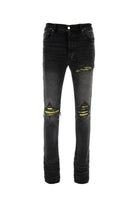 Jeans skinny realizzato in denim di cotone stretch slavato e sdrucito caratterizzato da strappi ricuciti sulla parte frontale.