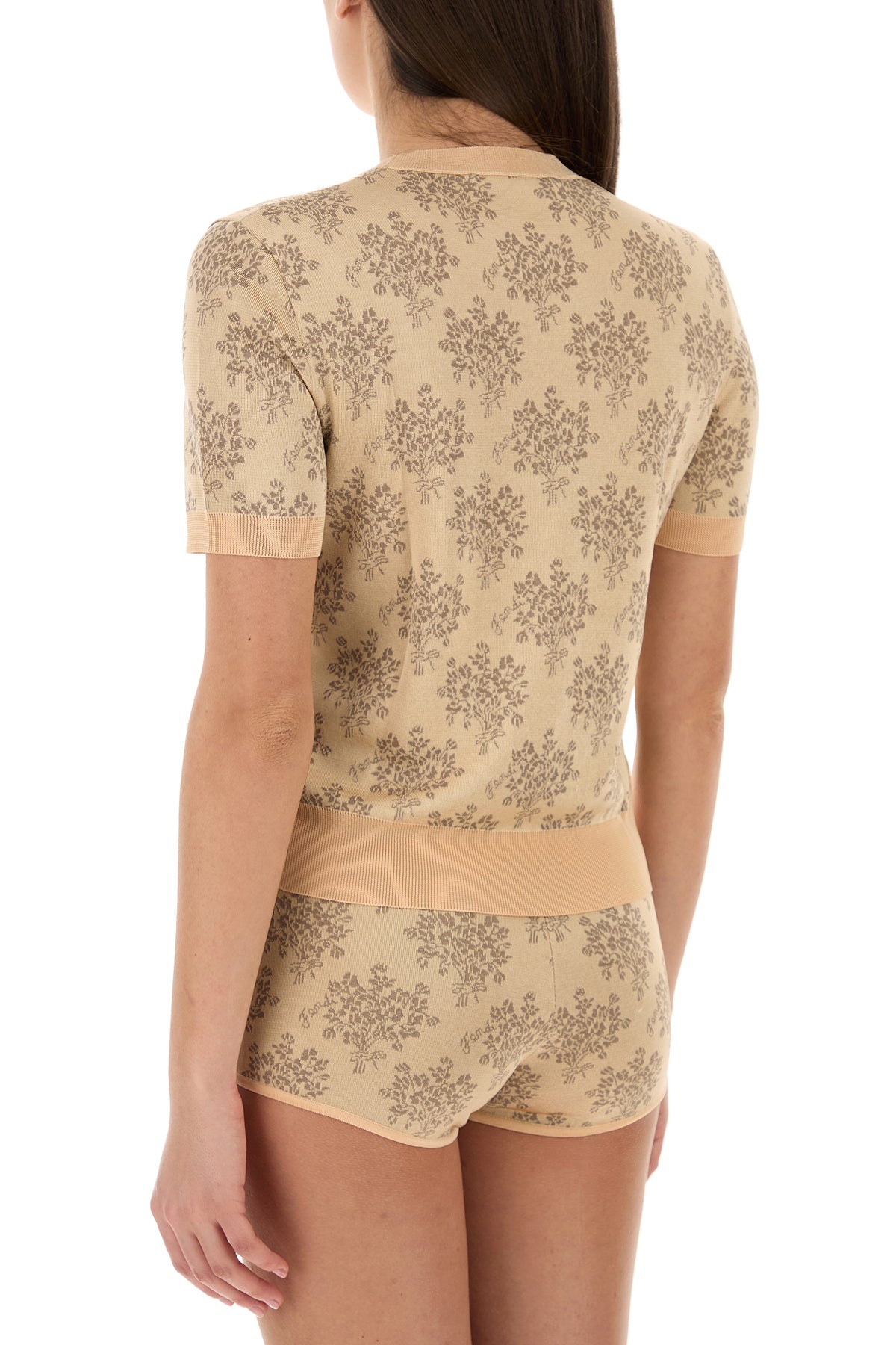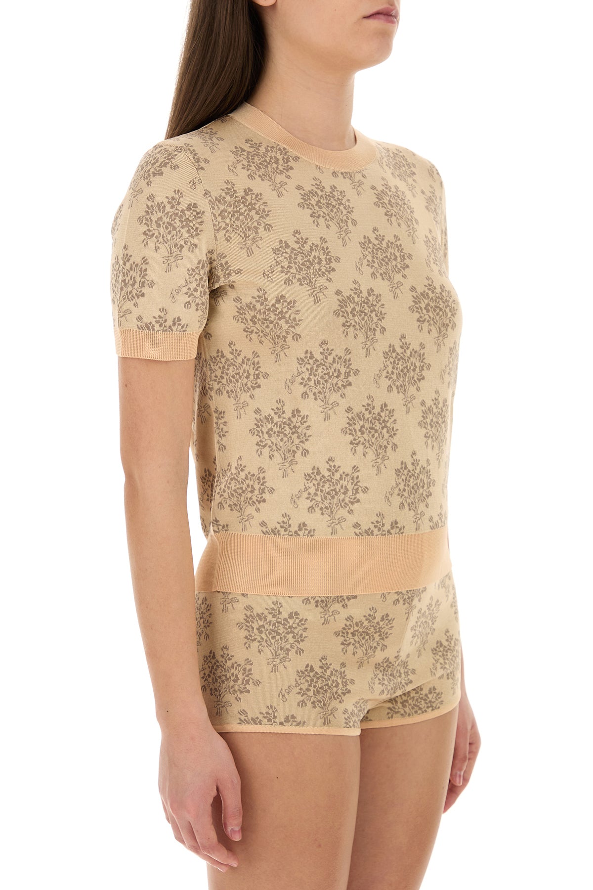 Maglione a maniche corte realizzato in viscosa caratterizzato da ricamo floreale su tutta la superficie.