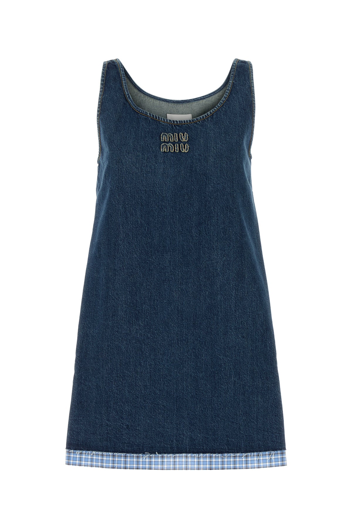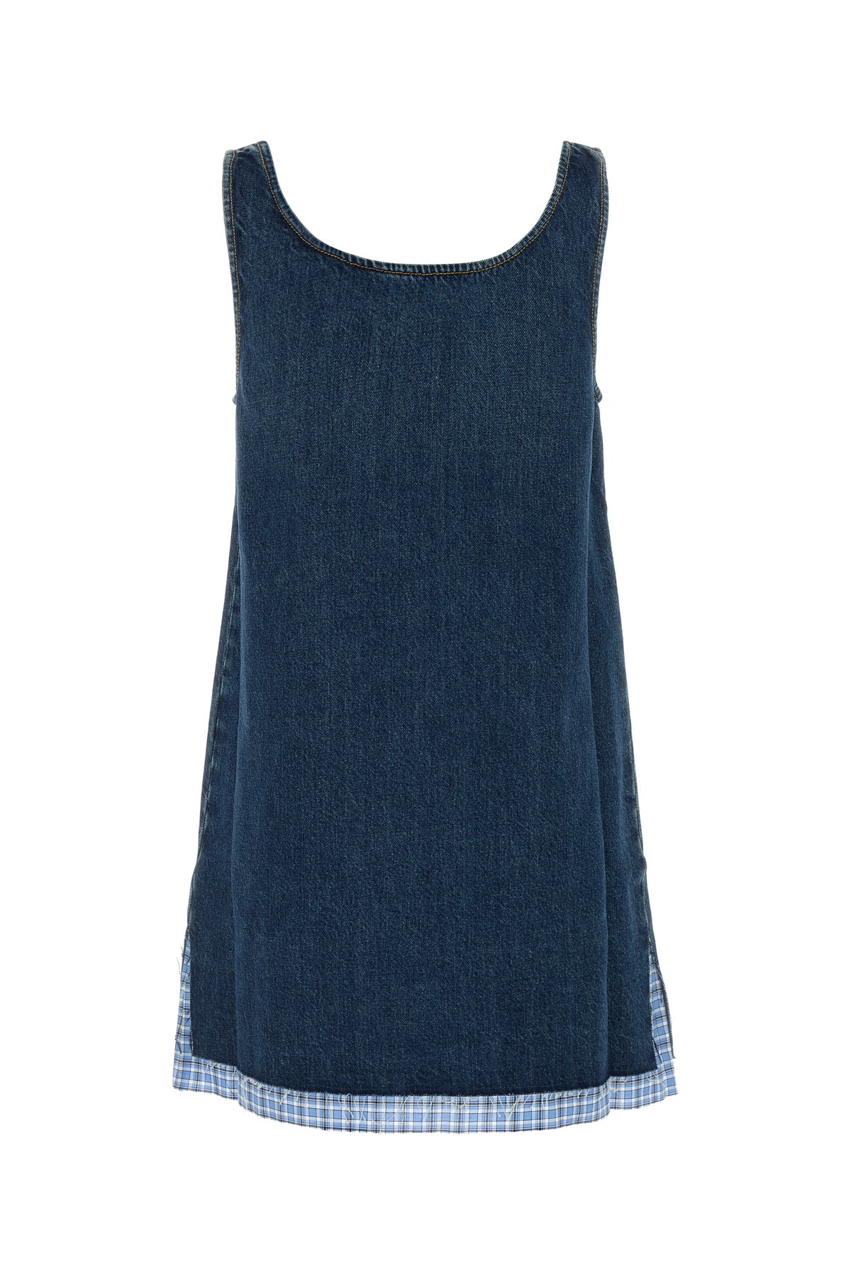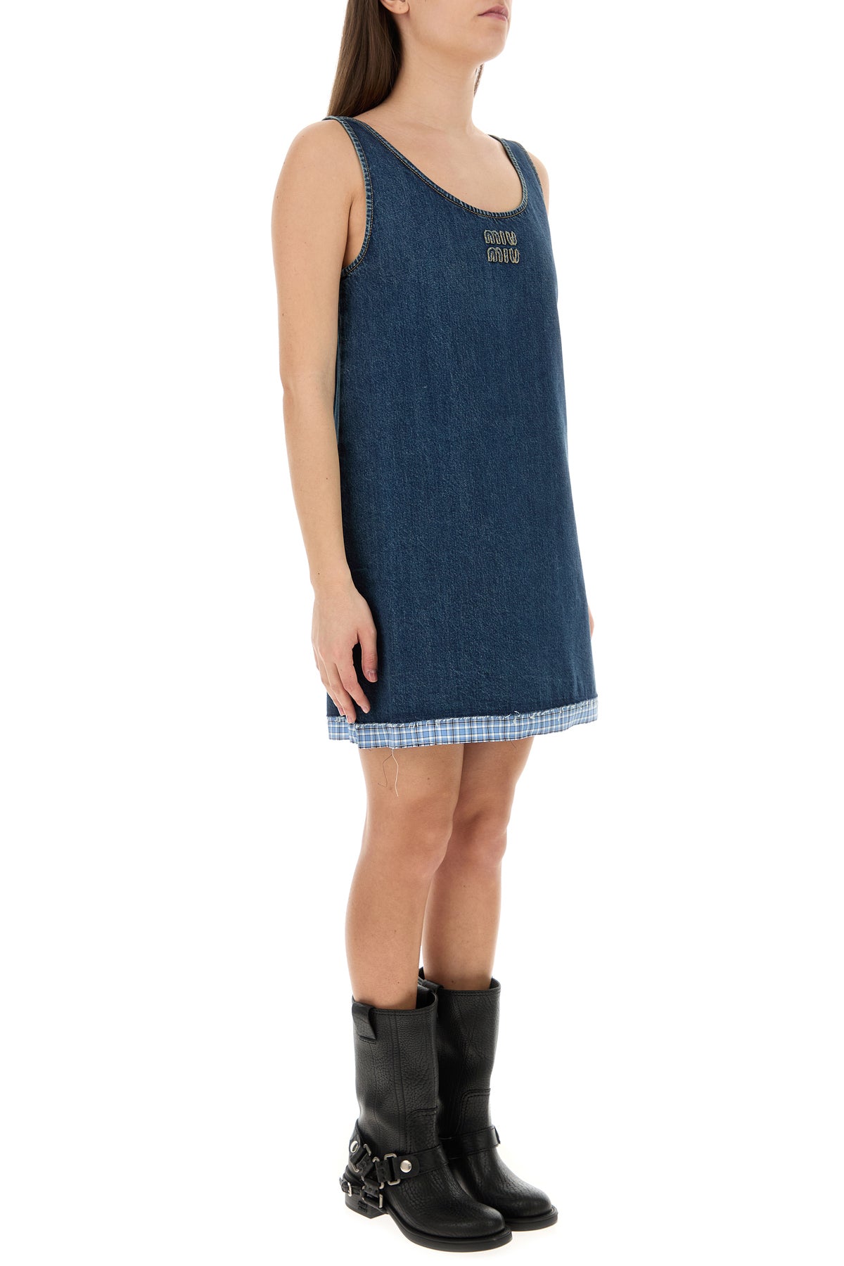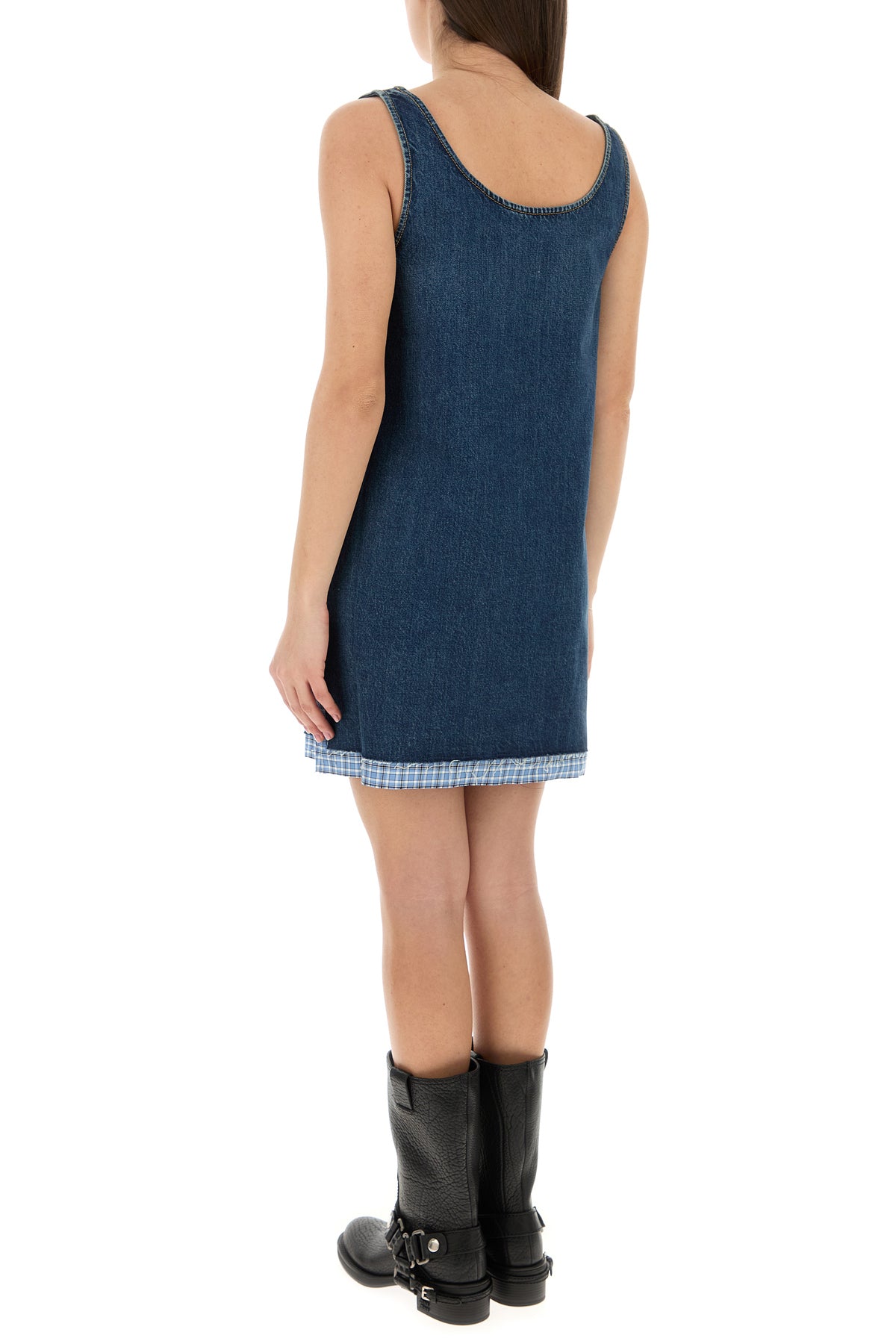Mini abito realizzato in denim di puro cotone leggermente slavato con inserto in popeline a motivo tartan sul fondo arricchito da applicazione logata tonale sulla parte frontale.