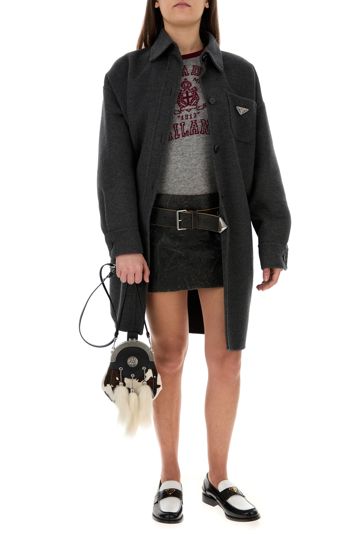 Minigonna realizzata in pelle di vitello ad effetto vintage arricchita da cintura amovibile in pelle tonale con anelli metallici e iconico triangolo logato.