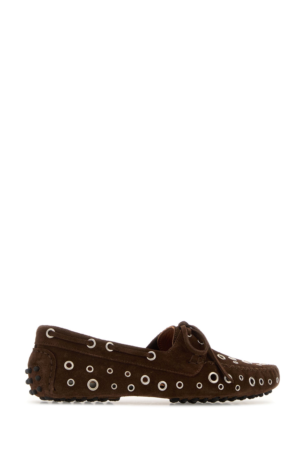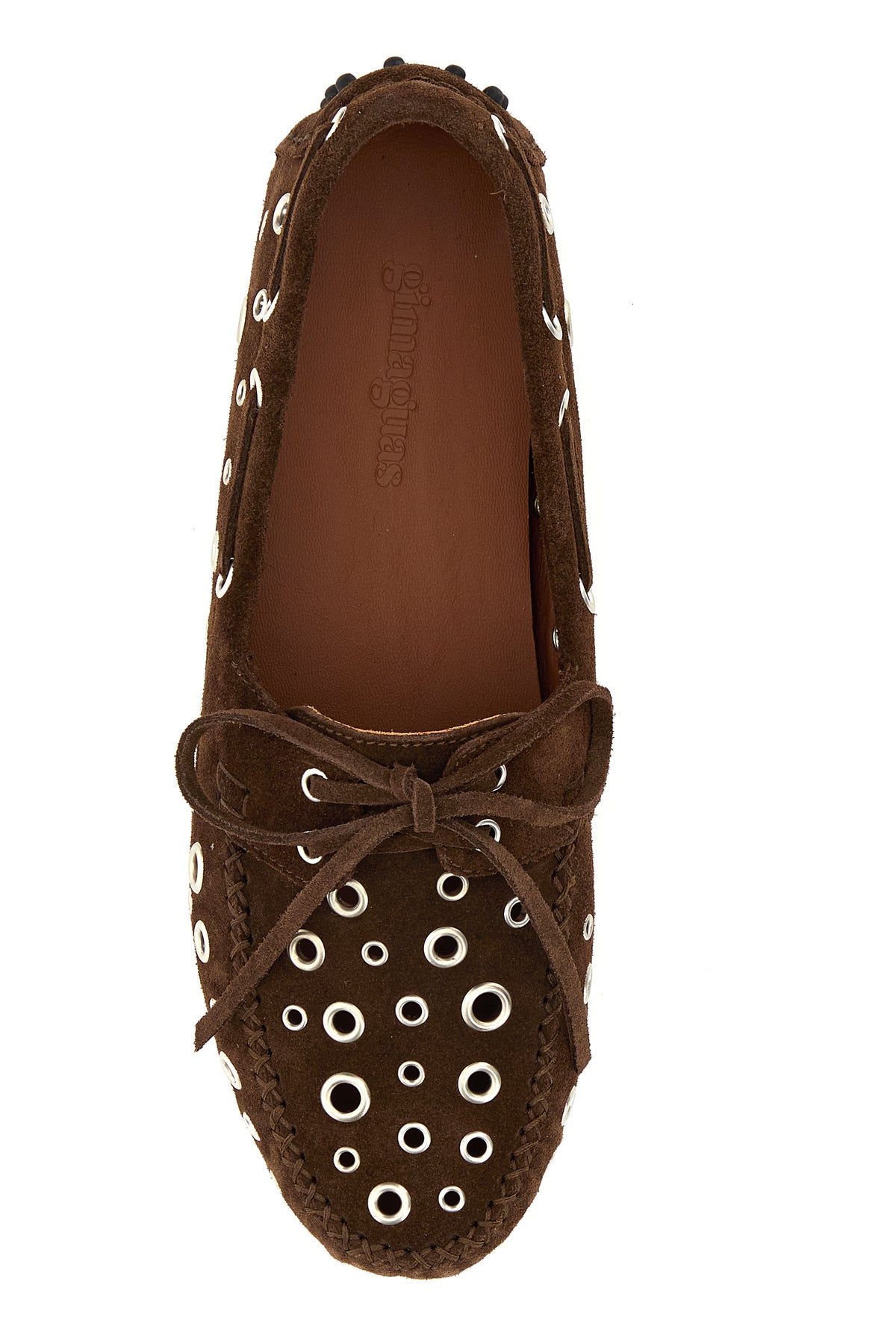 Mocassini realizzati in pelle scamosciata arricchiti da borchie metalliche su tutta la superficie.