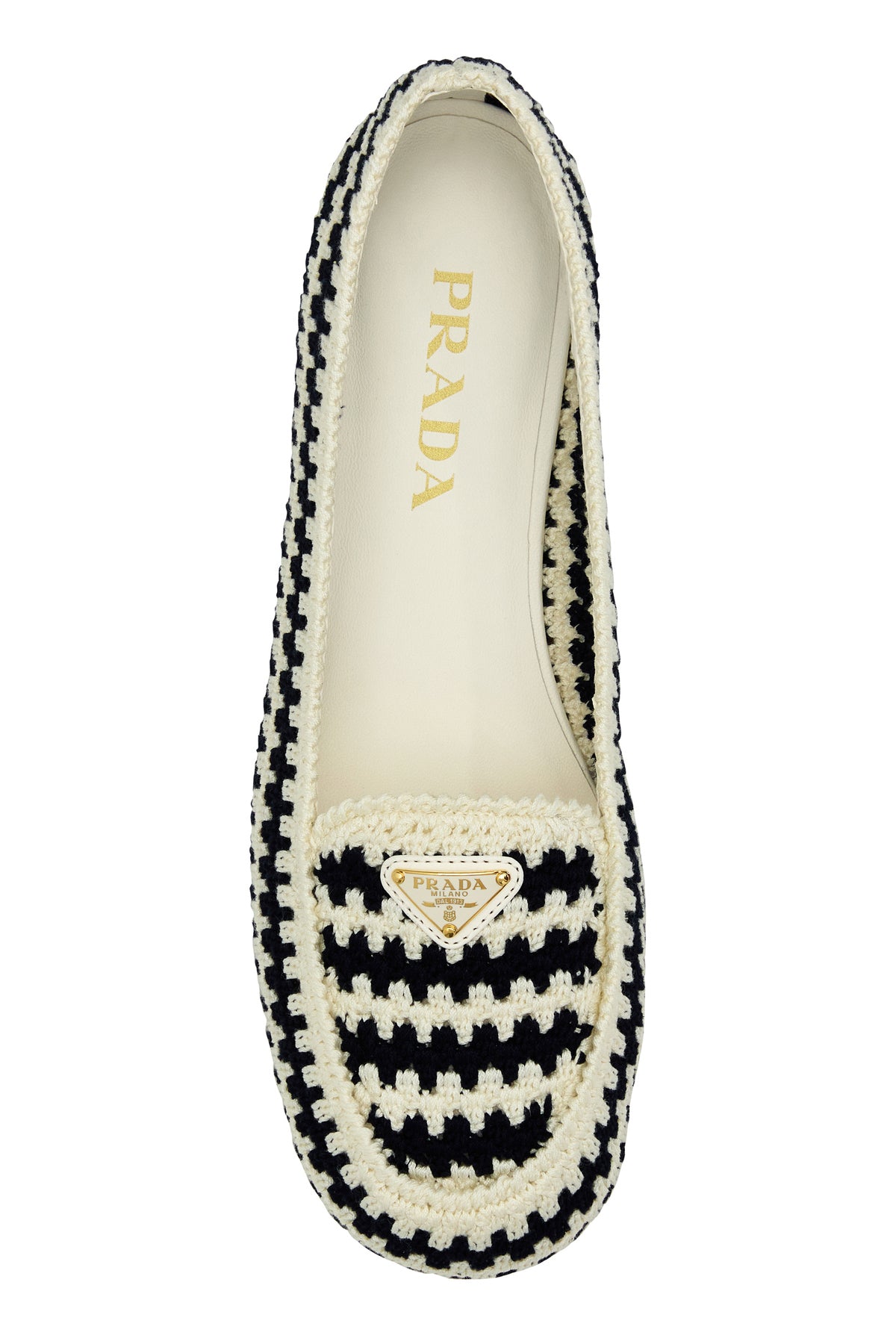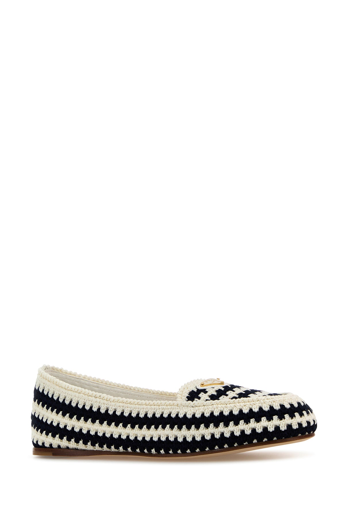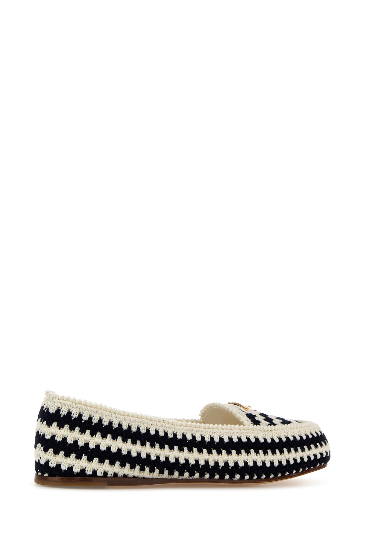 Mocassini realizzati in crochet caratterizzati da ricamo a righe su tutta la superficie arricchiti da iconico triangolo metallico logato sul collo del piede.