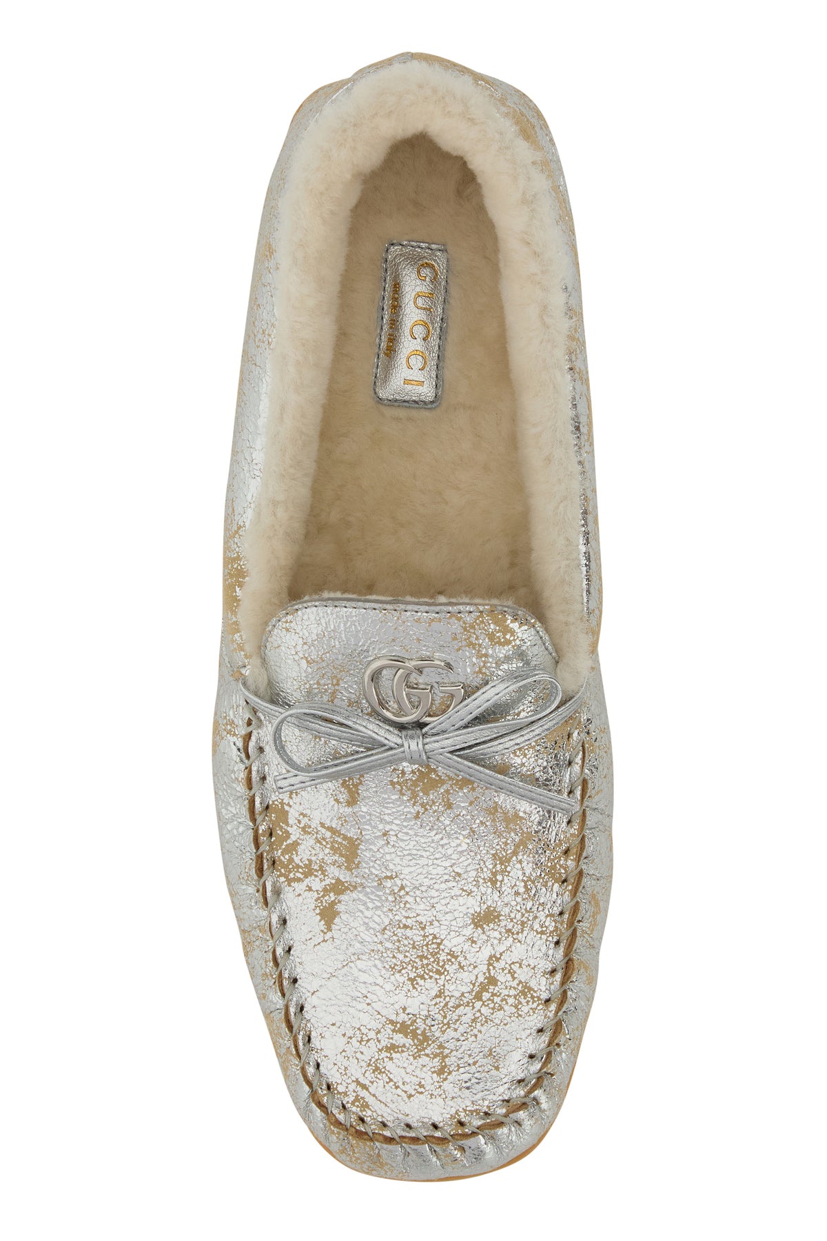 Mocassini realizzati in pelle laminata ad effetto vintage arricchiti da dettaglio metallico GG e fiocco decorativo sul collo del piede.