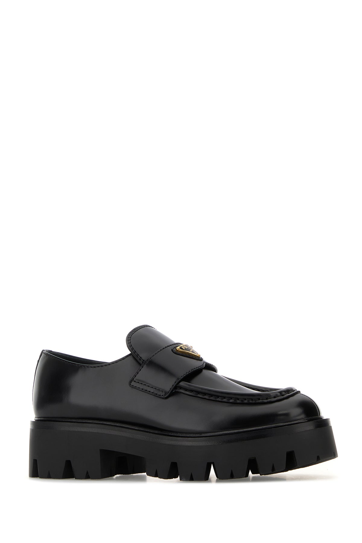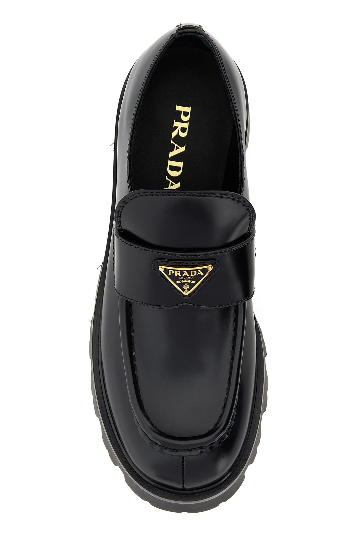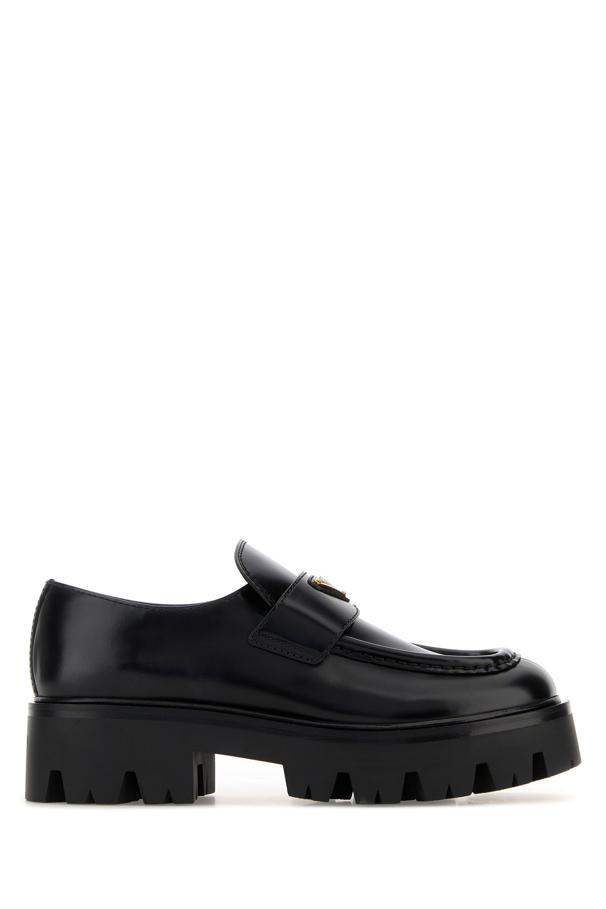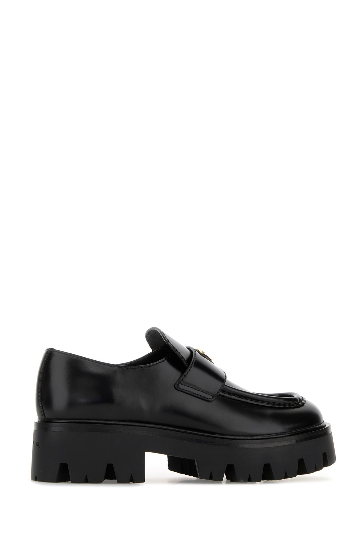 Mocassini realizzati in pelle liscia dal finish lucido arricchiti da iconico triangolo metallico logato sulla mascherina.