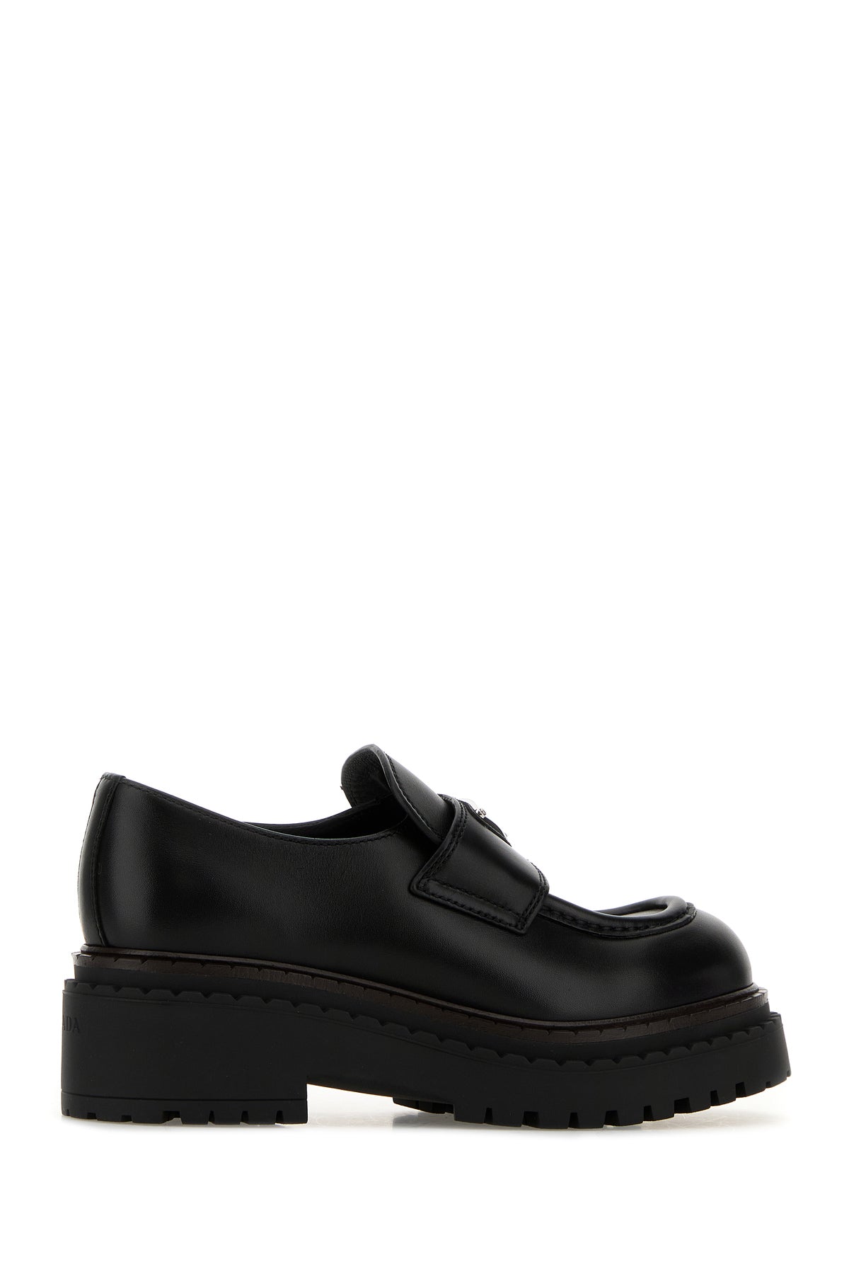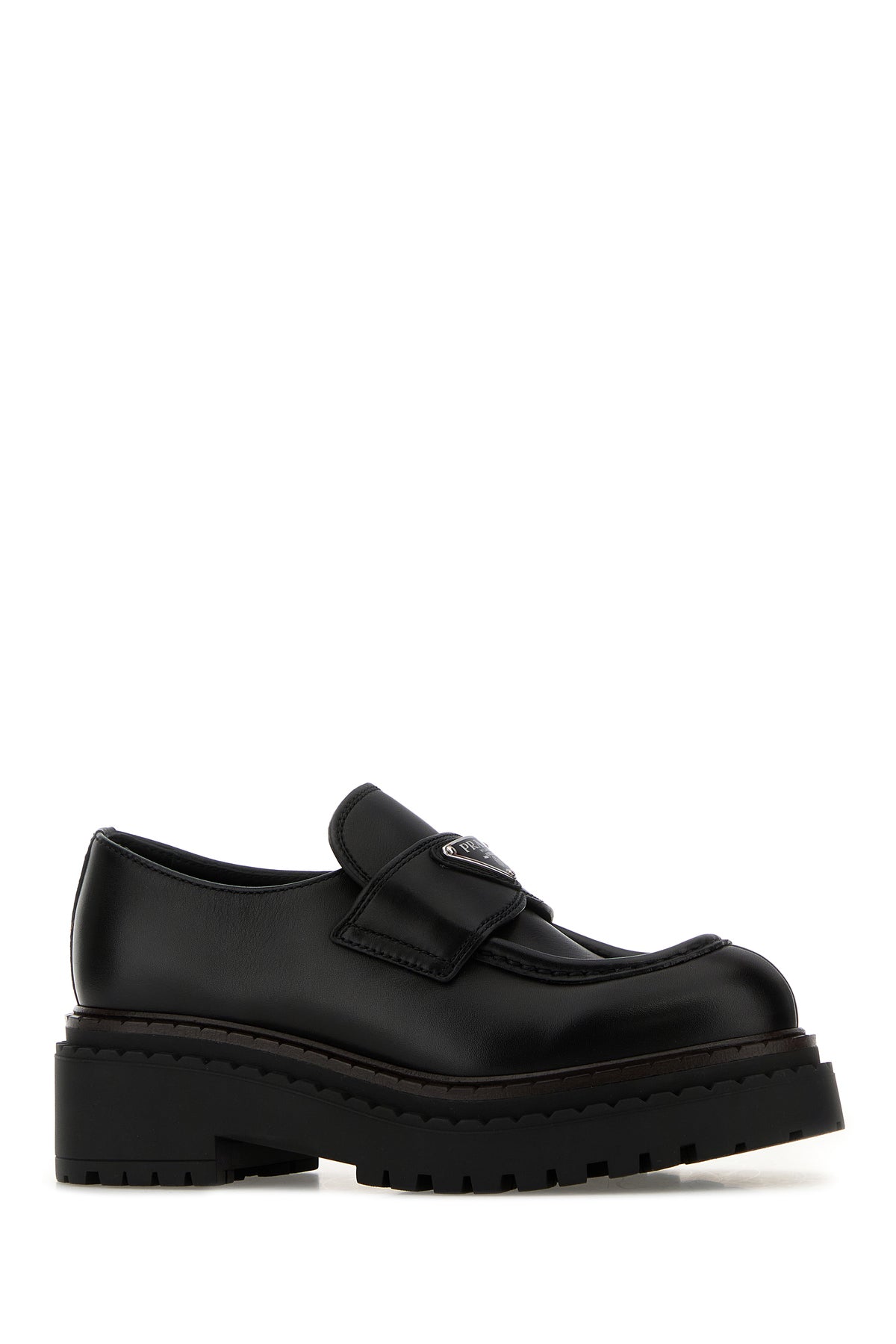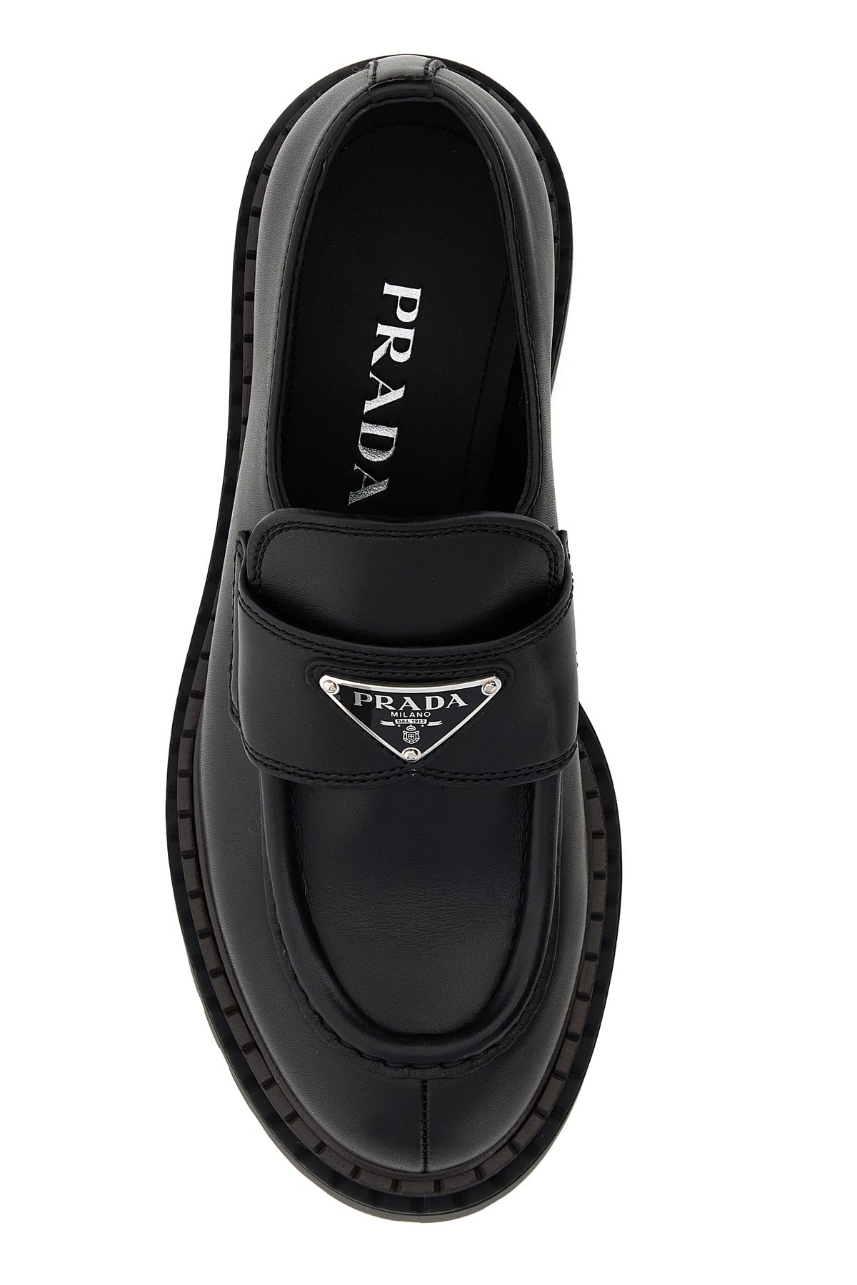 Mocassini realizzati in pelle martellata arricchiti da iconico triangolo metallico logato sulla mascherina.