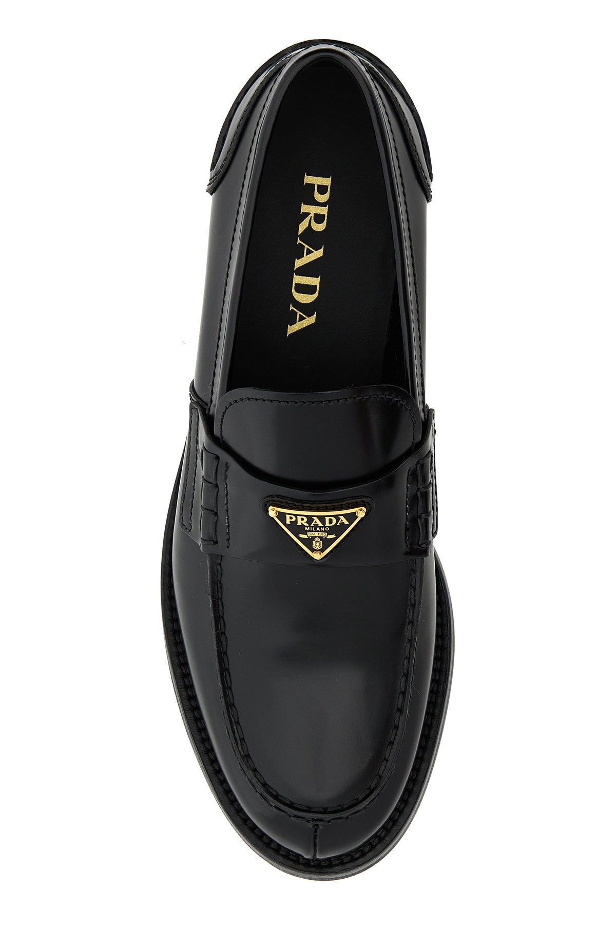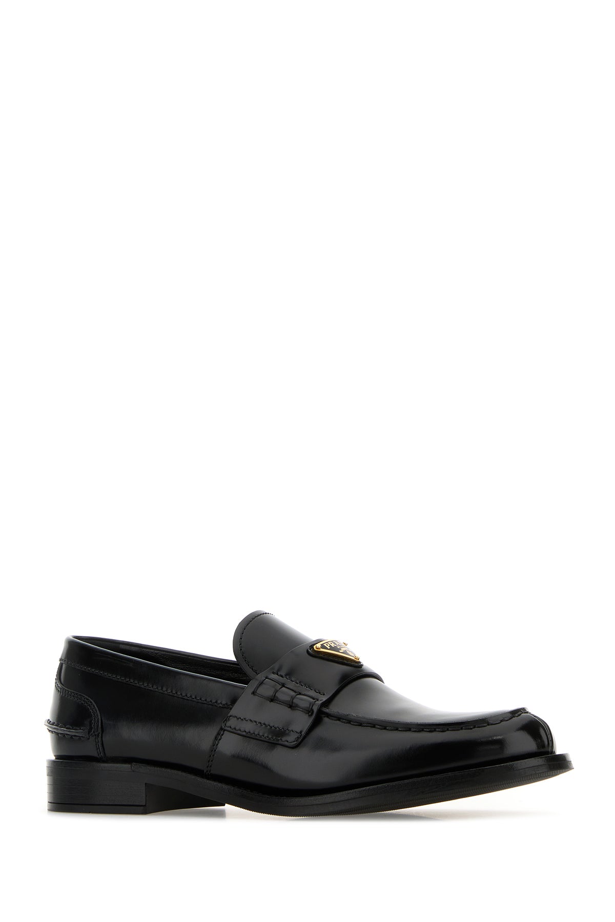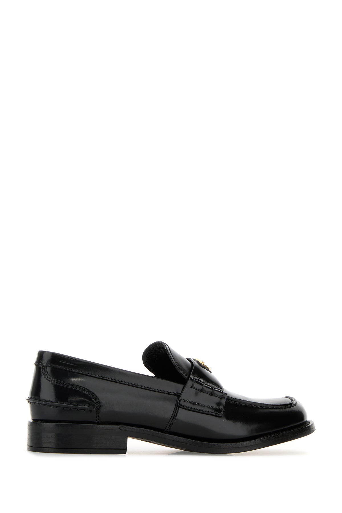 Mocassini realizzati in pelle dal finish lucido arricchiti da iconico triangolo metallico logato sulla mascherina.