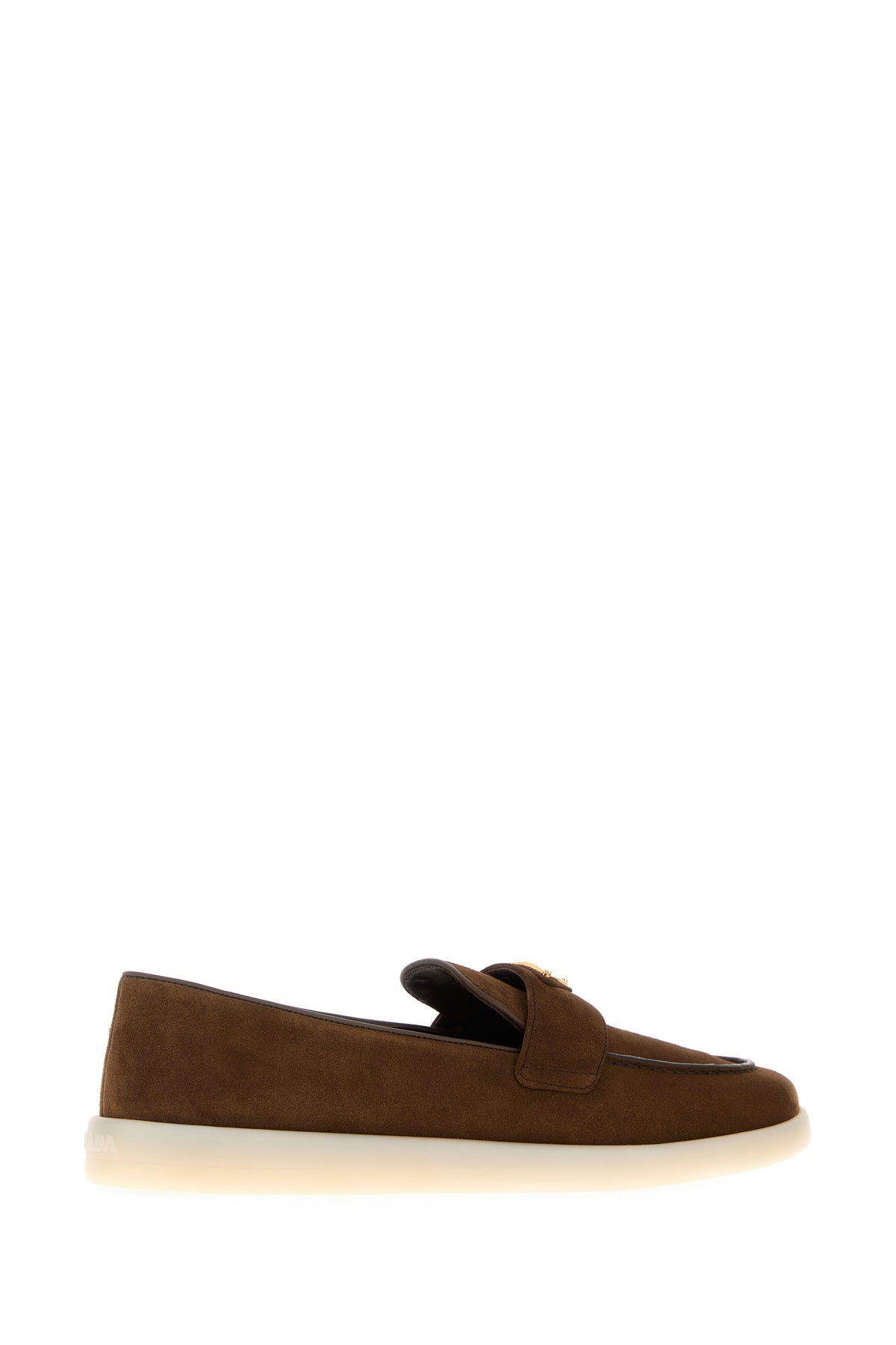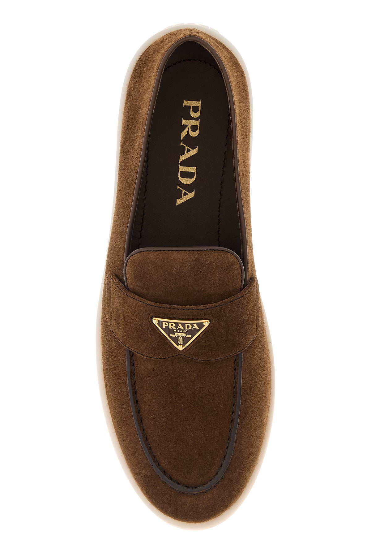 Mocassini realizzati in pelle scamosciata arricchiti da iconico triangolo metallico logato sulla mascherina.
