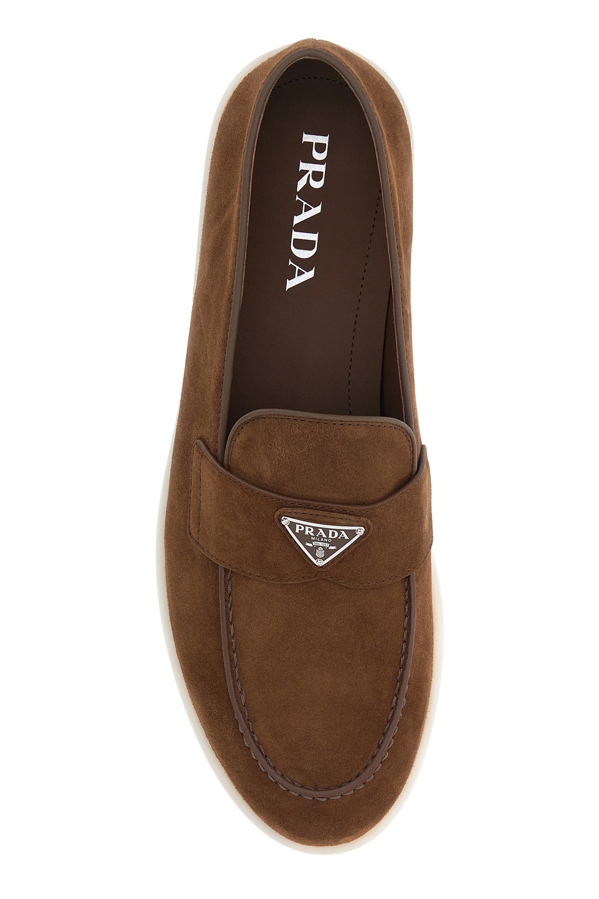 Mocassini realizzati in pelle scamosciata caratterizzati da logo in rilievo sul retro arricchiti da iconico triangolo metallico logato sulla mascherina.