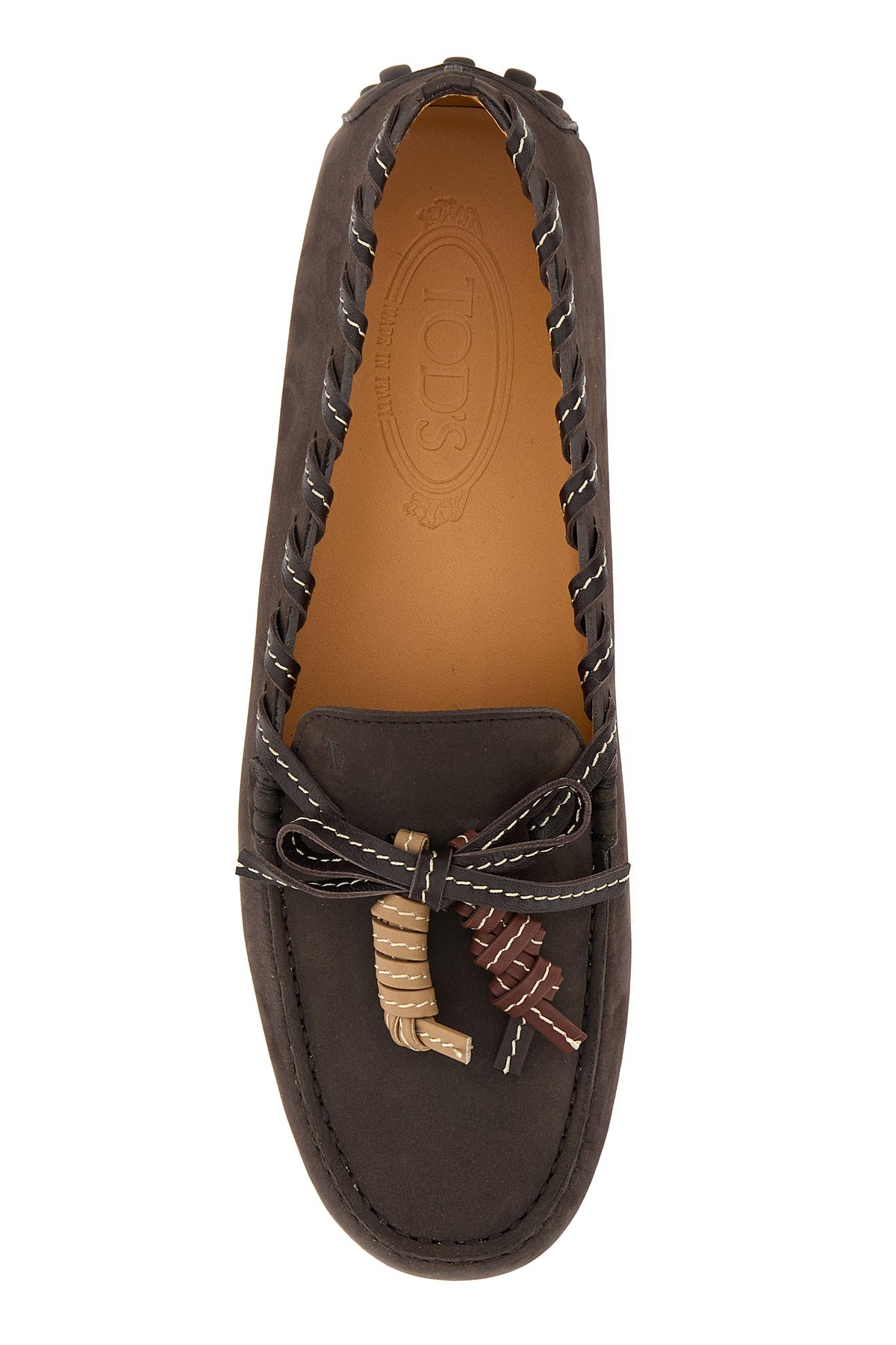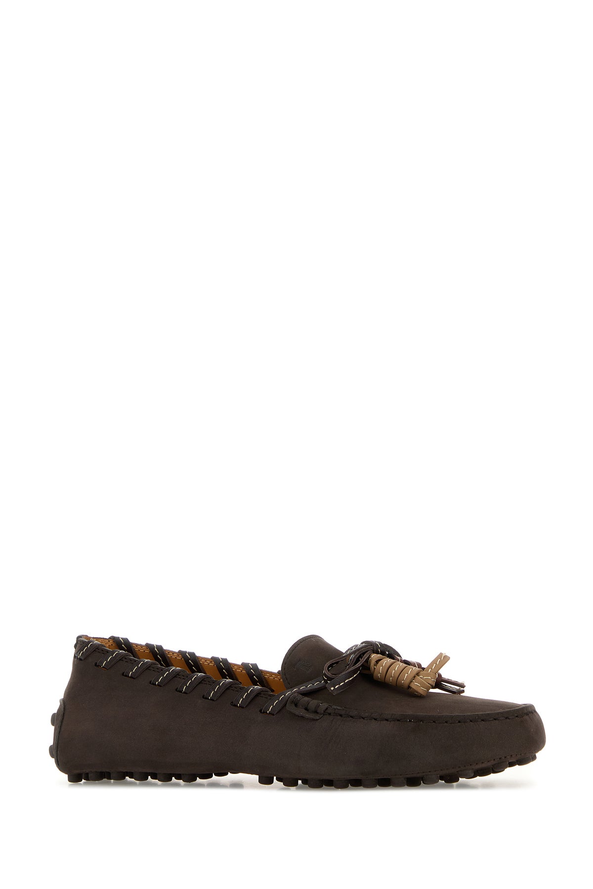 Mocassini realizzati in pelle scamosciata arricchiti da fiocco decorativo con nappine sulla parte frontale.
