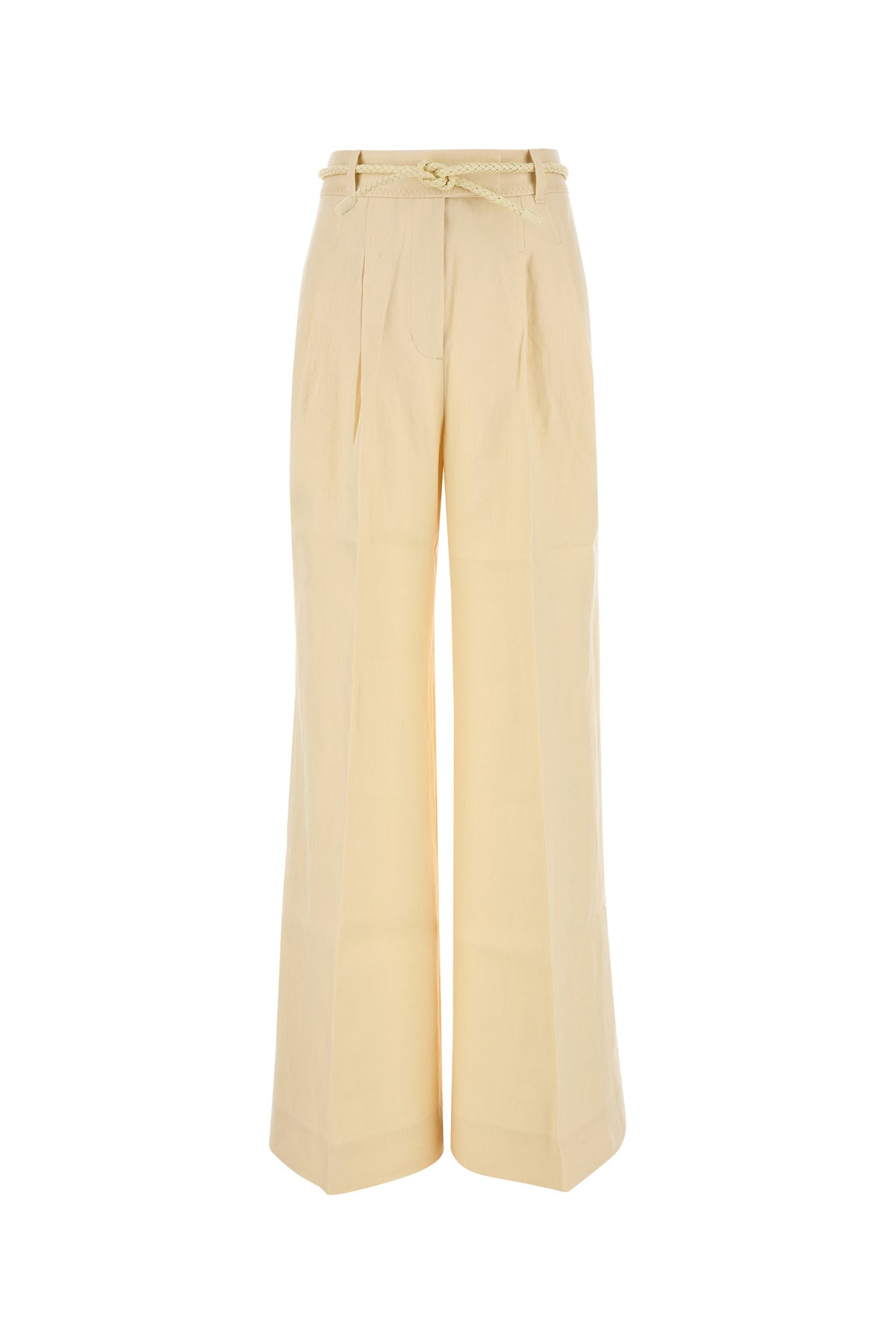 Pantalone dalla gamba ampia realizzato in puro lino arricchito da cintura in pelle intrecciata in vita.