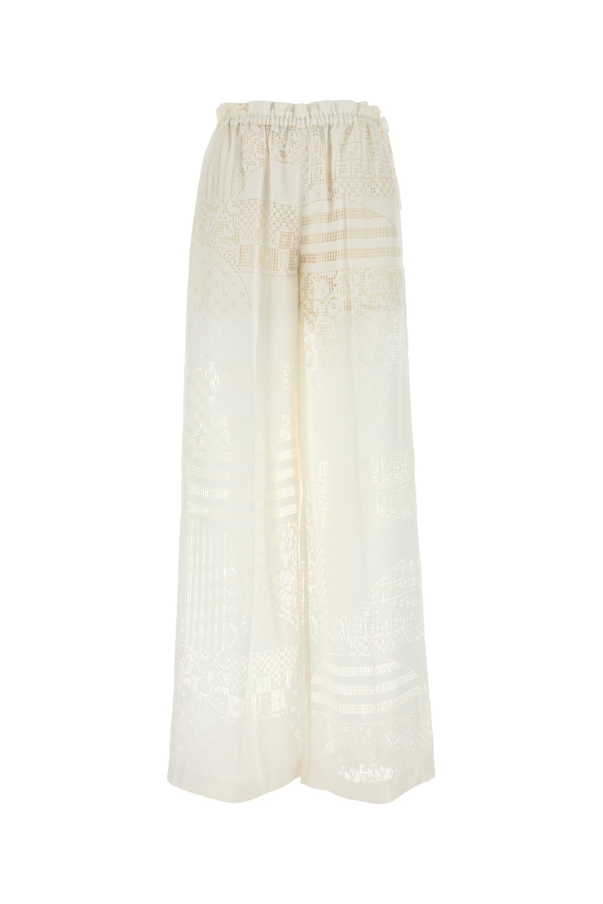 Pantalone dalla gamba ampia realizzato in viscosa e seta caratterizzato da motivo Patchwork su tutta la superficie.