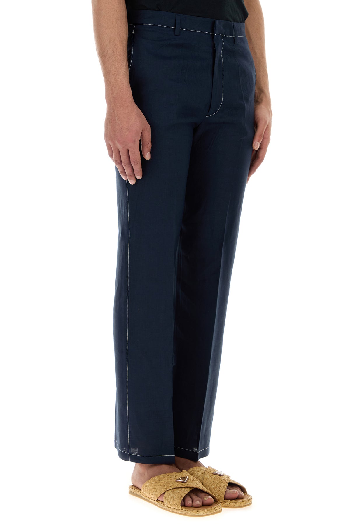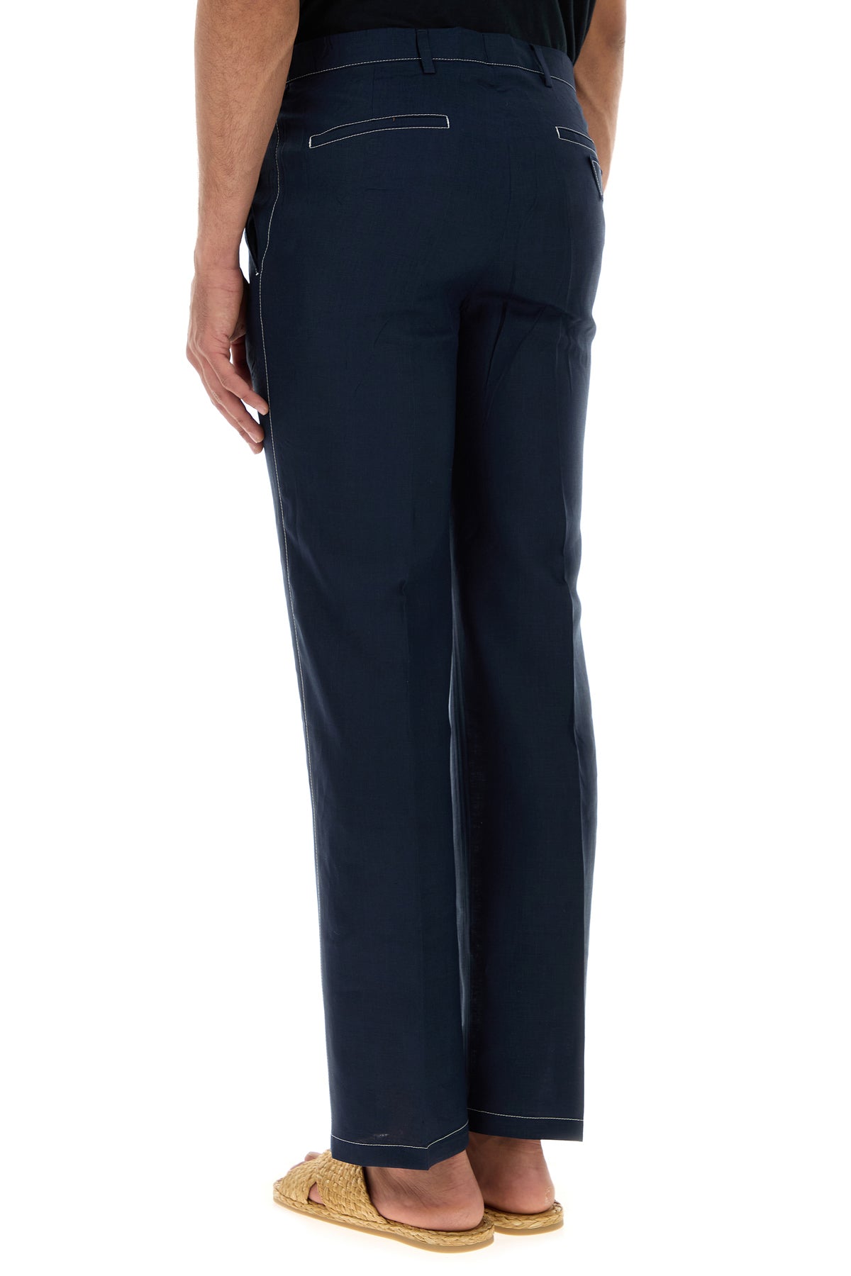 Pantalone realizzato in puro lino caratterizzato da cuciture a contrasto arricchito da iconico triangolo in tessuto tonale sul retro.
