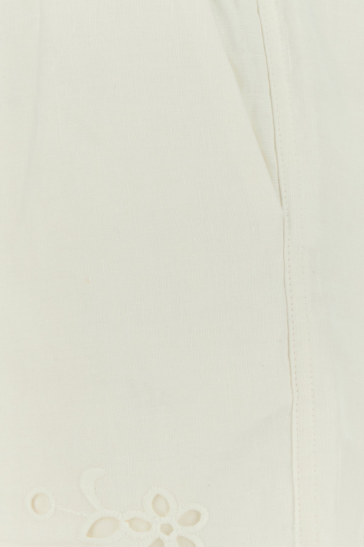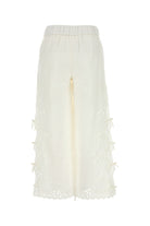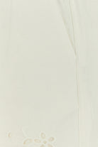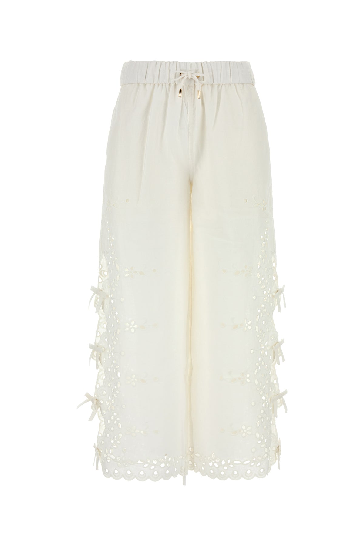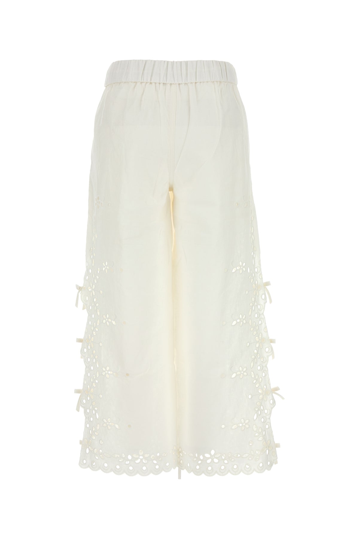 Pantalone realizzato in lino e cotone caratterizzato da particolari ricami arricchiti da fiocchi decorativi sui lati.