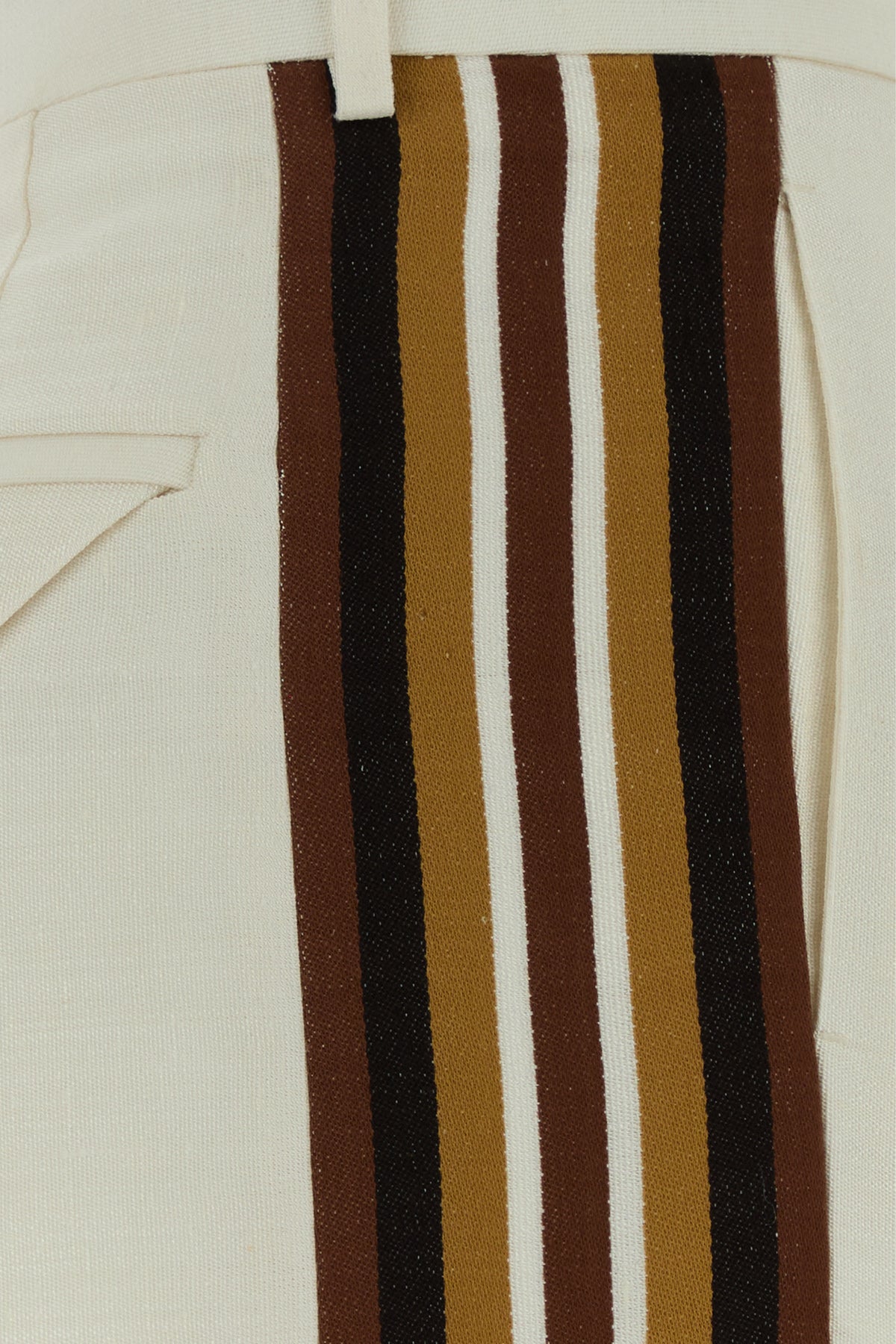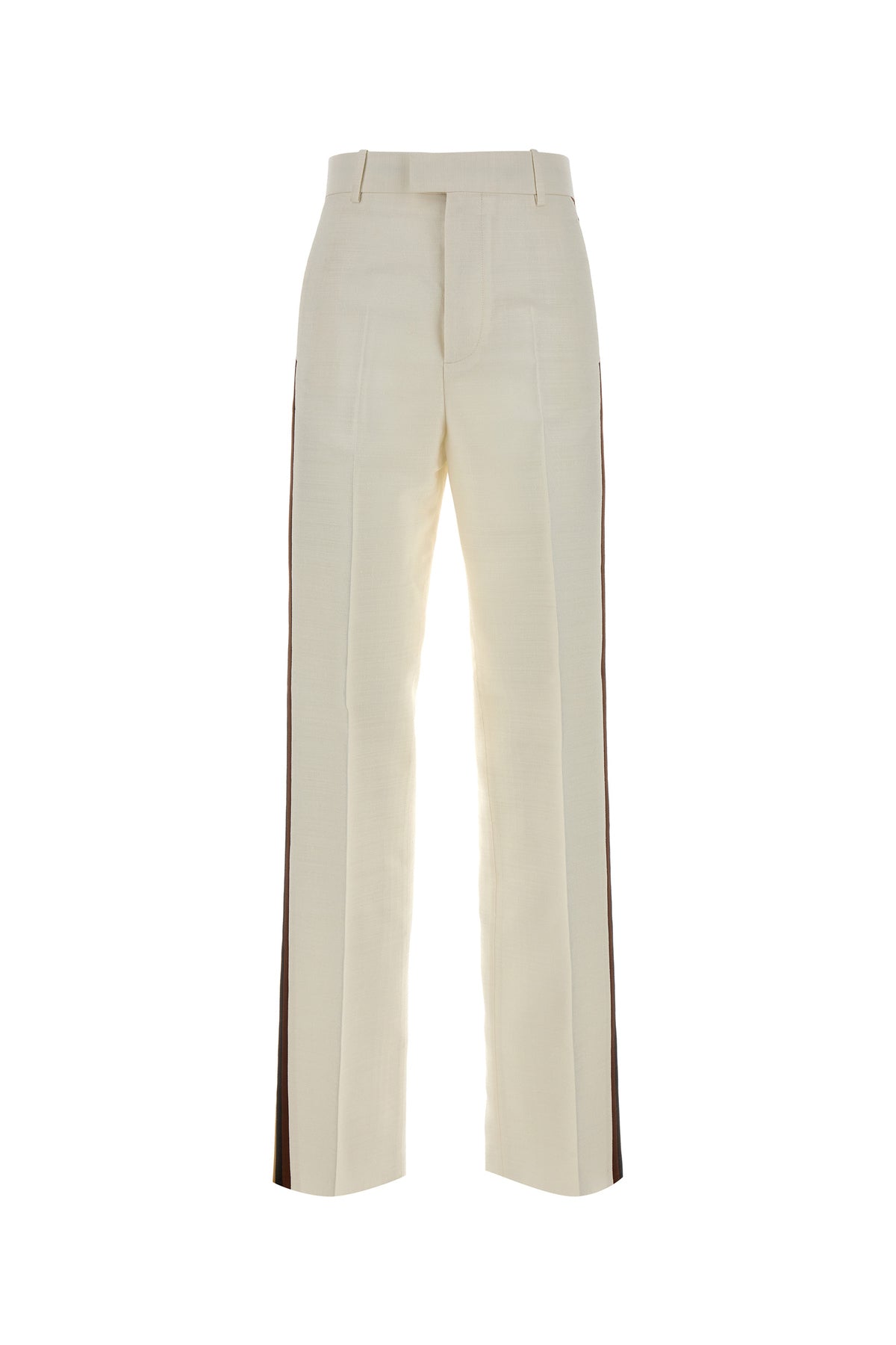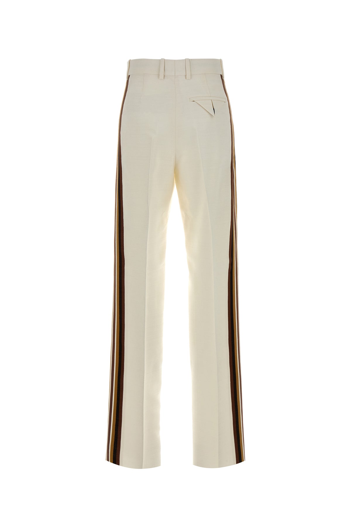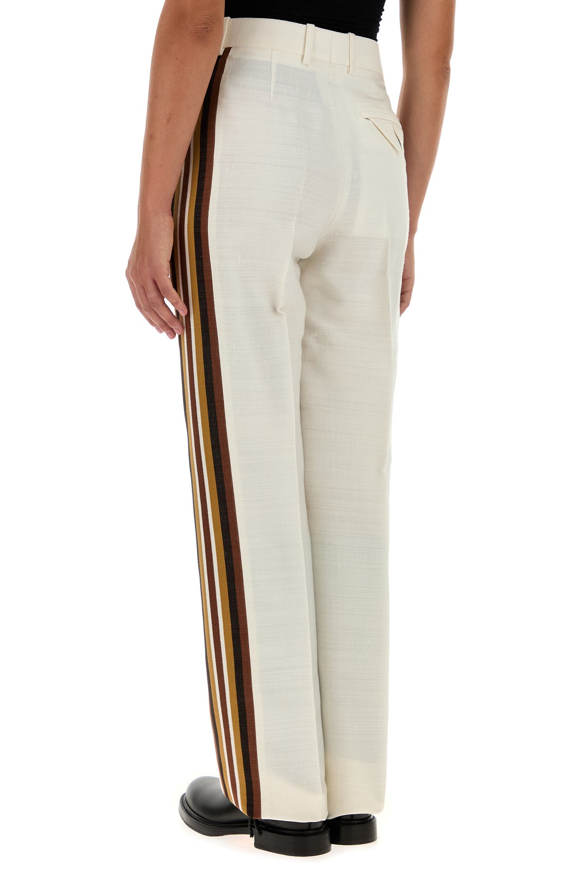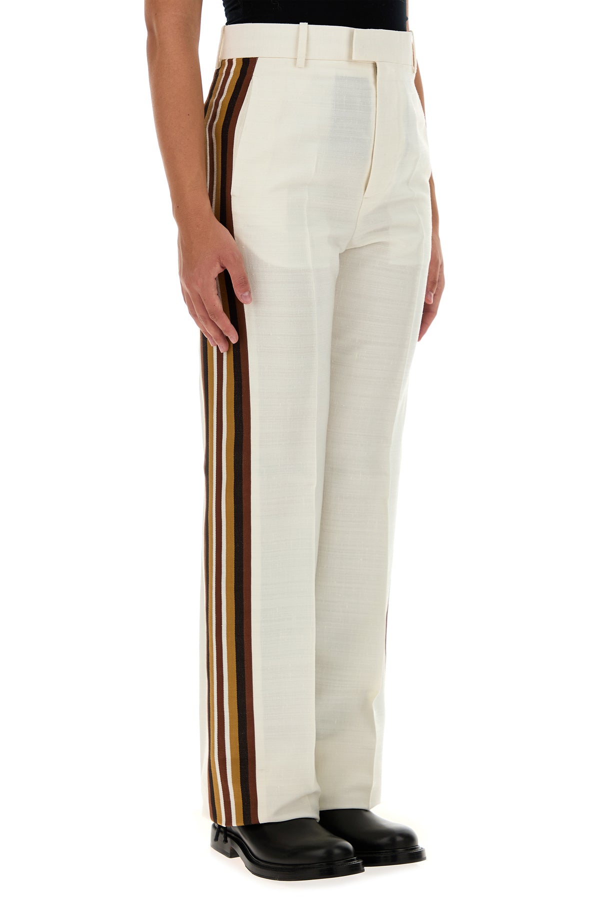 Pantalone realizzato in misto viscosa arricchito da bande a contrasto sui lati.