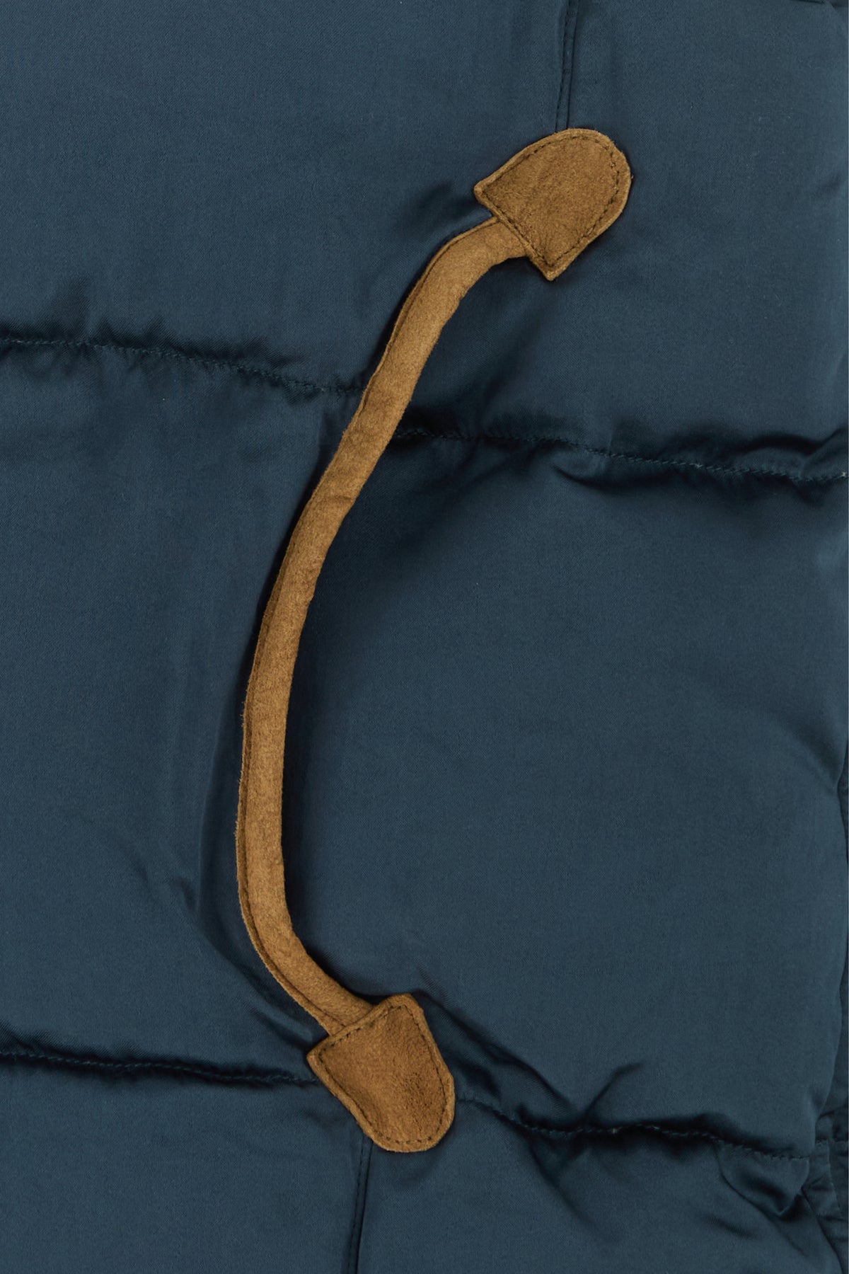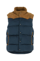 Piumino smanicato realizzato in rayon trapuntato con inserto in pelle a contrasto sulla parte superiore.