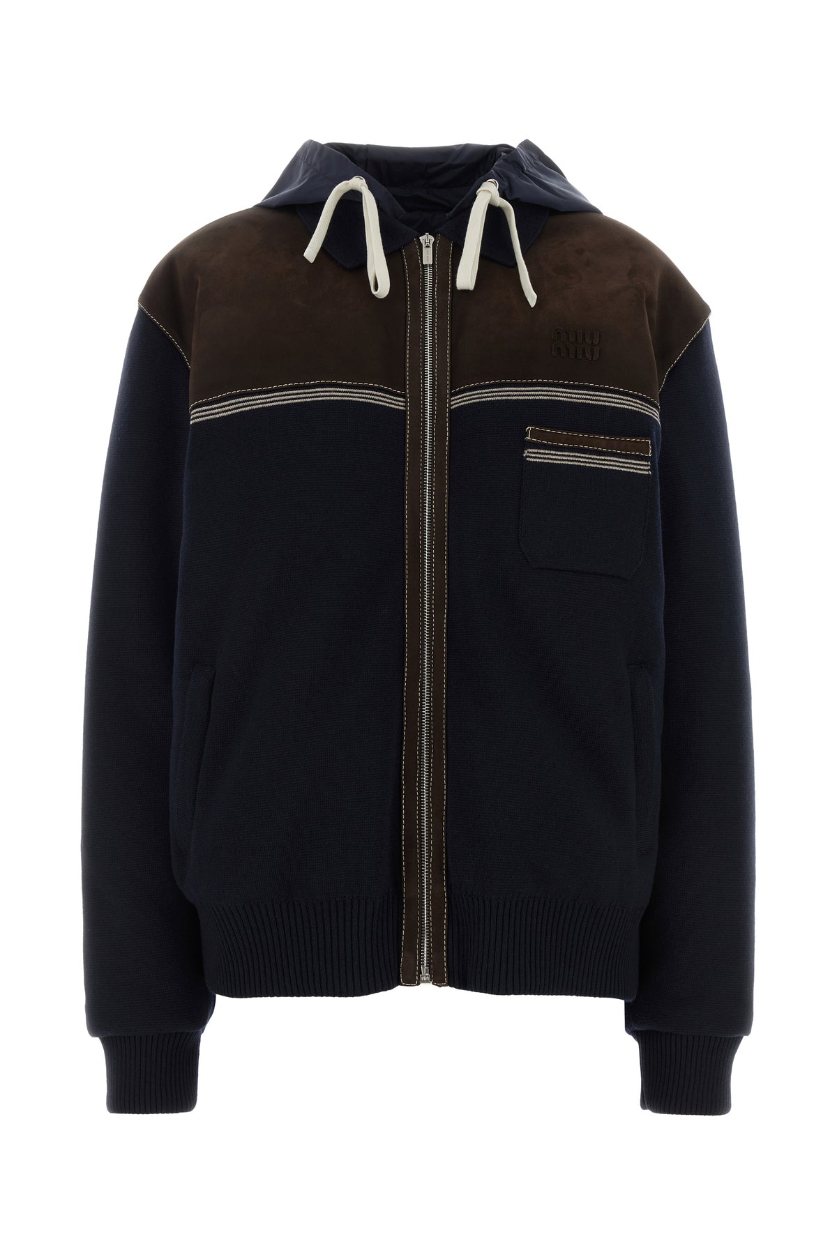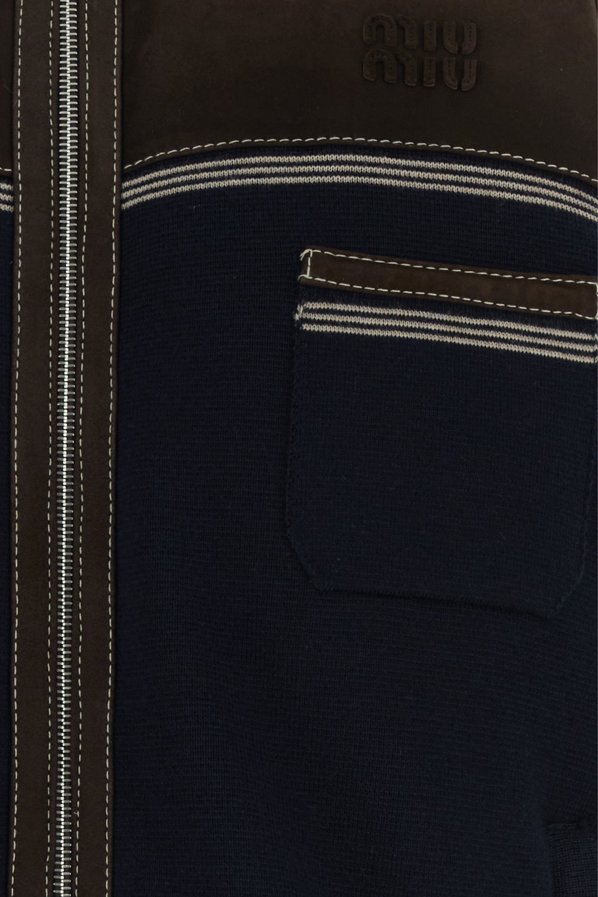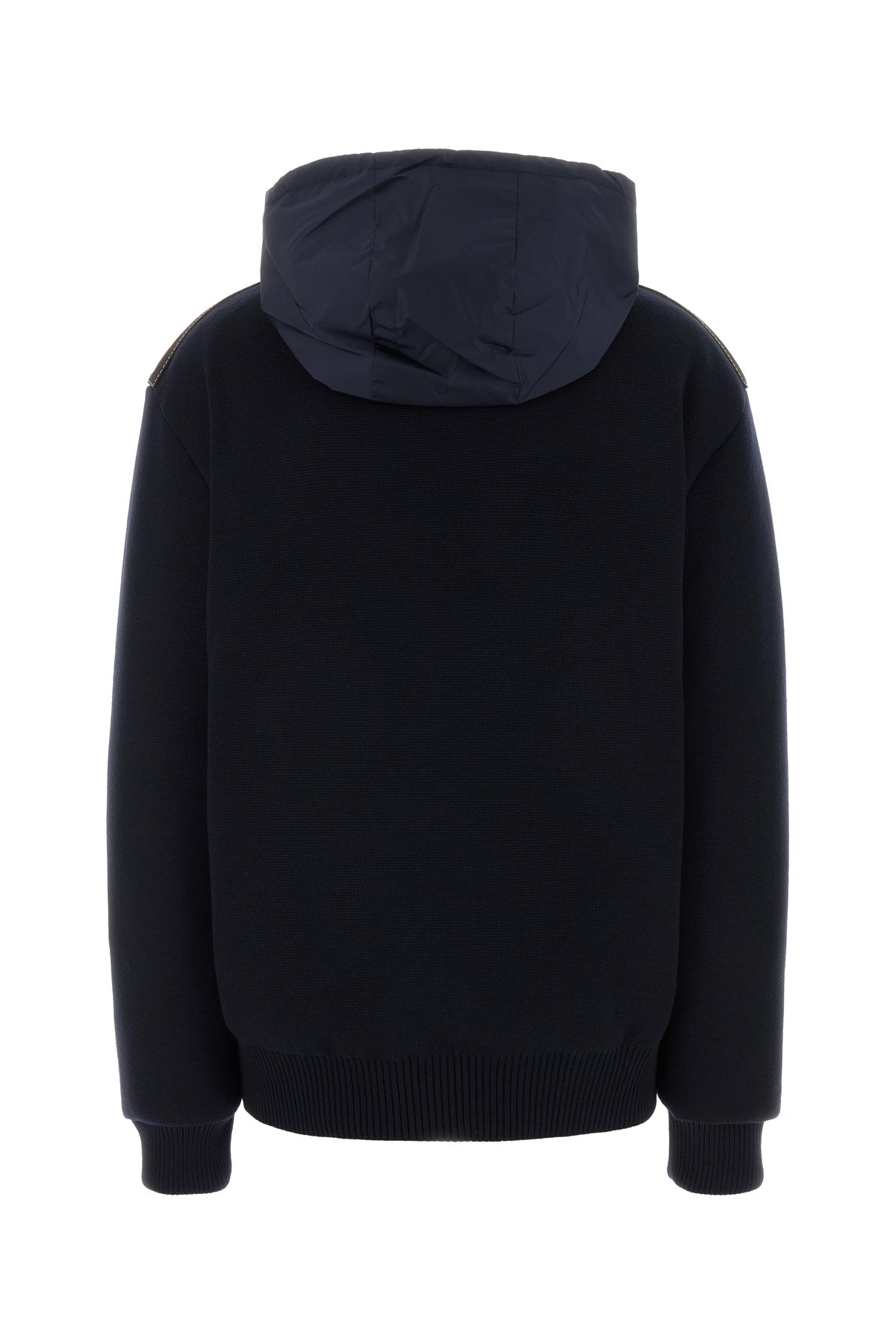 Piumino realizzato in maglia di pura lana vergine con inserto in pelle a contrasto arricchito da applicazione logata sul petto.