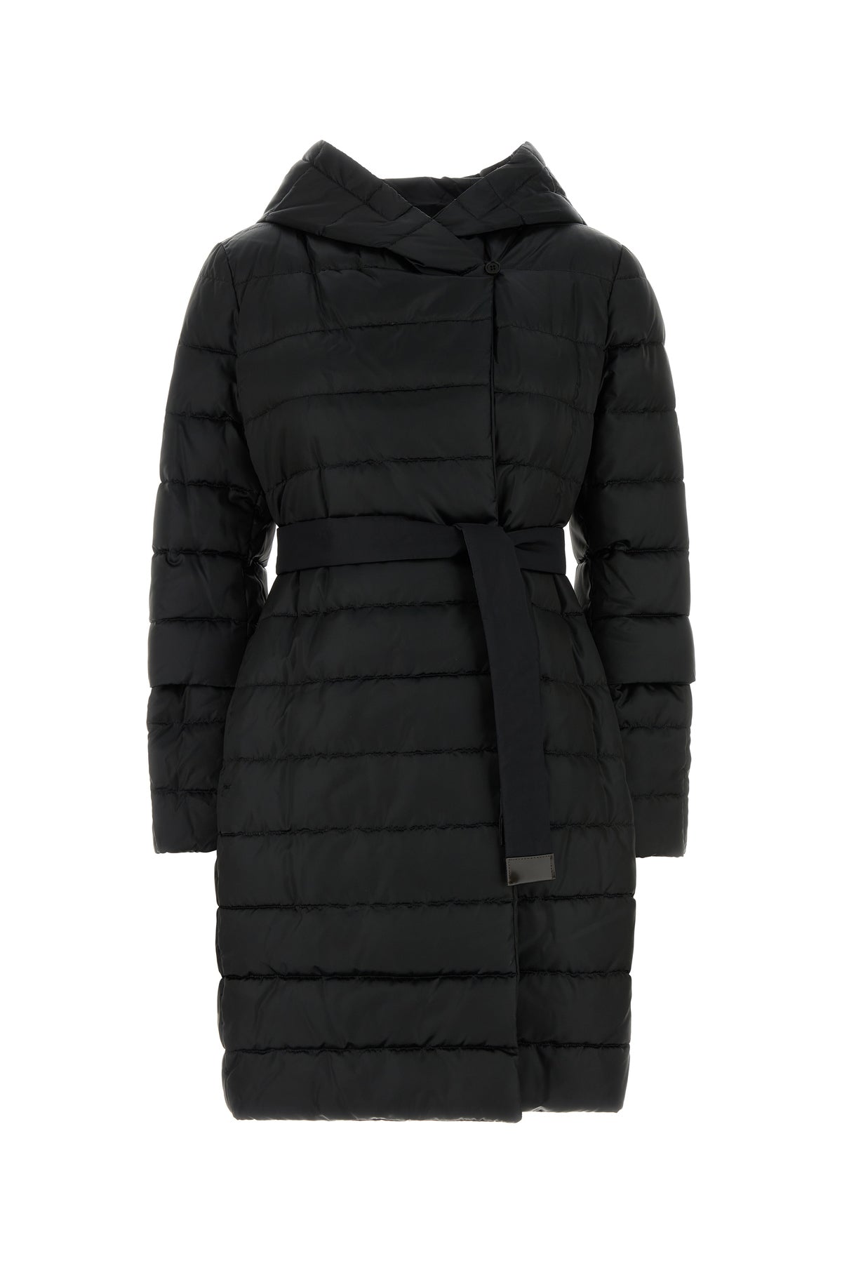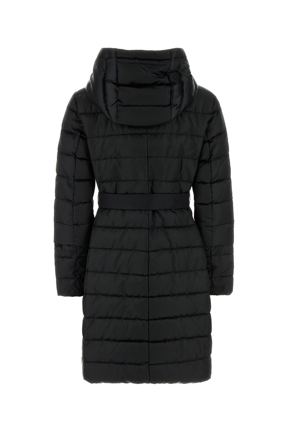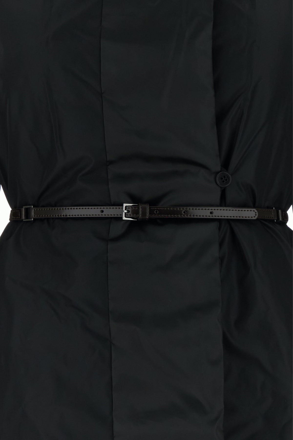 Piumino realizzato in misto nylon trapuntato arricchito da cintura amovibile da annodare in vita.
