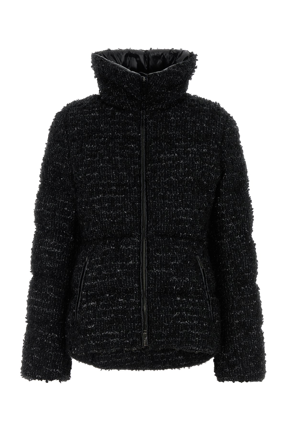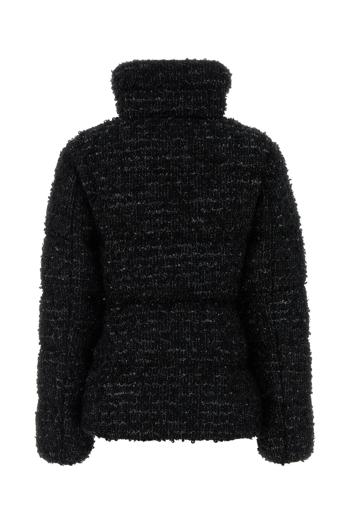 Piumino realizzato in bouclé di misto mohair con fili in lurex arricchito da applicazione logata tonale sulla manica.