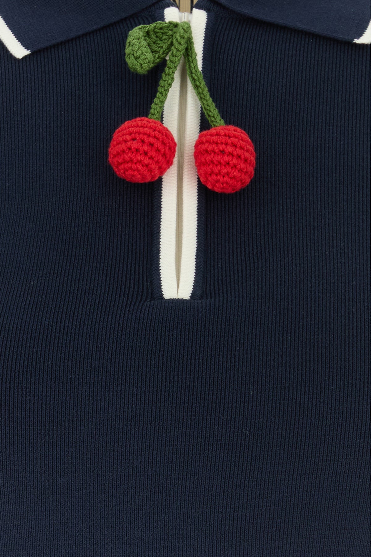 Polo realizzata in puro cotone arricchita da applicazione Cherryfic sulla chiusura parziale mediante zip.