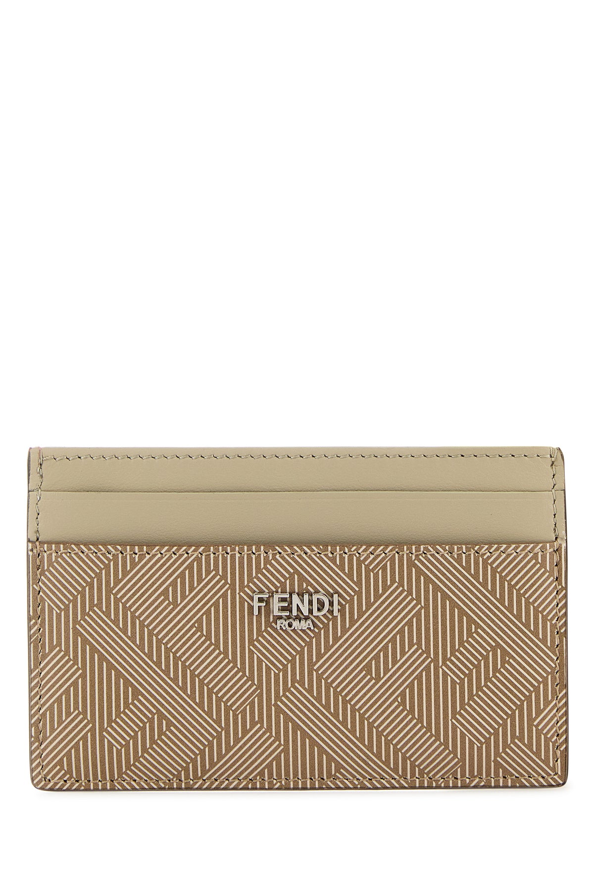 Portacarte realizzato in pelle di vitello liscia caratterizzata da stampa a motivo FF sulla parte frontale e sul retro arricchita da logo in lettere metalliche sulla parte frontale.