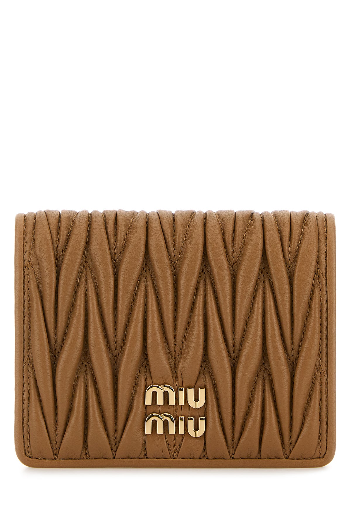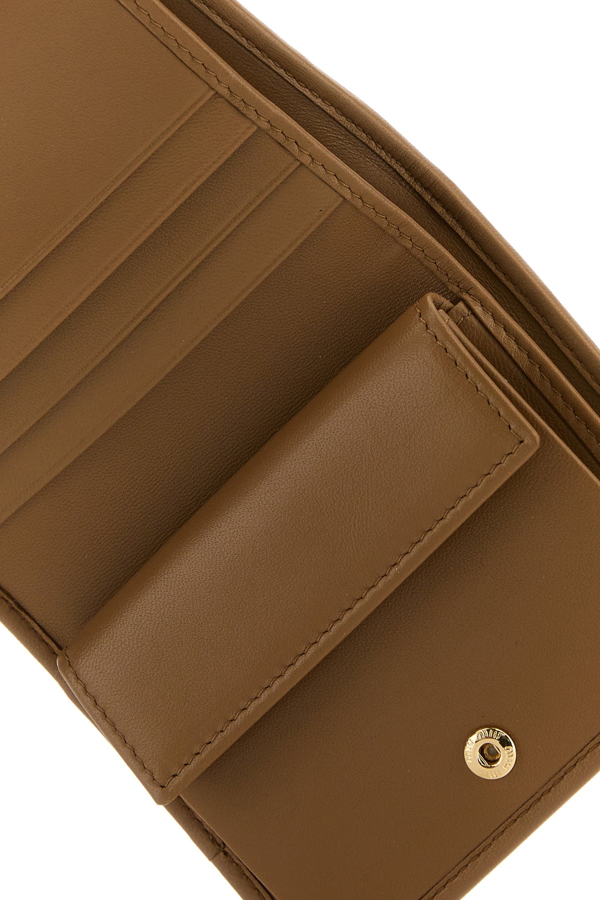 Portafoglio realizzato in pelle matelassé laminata arricchito da logo in lettere metalliche sulla parte frontale.