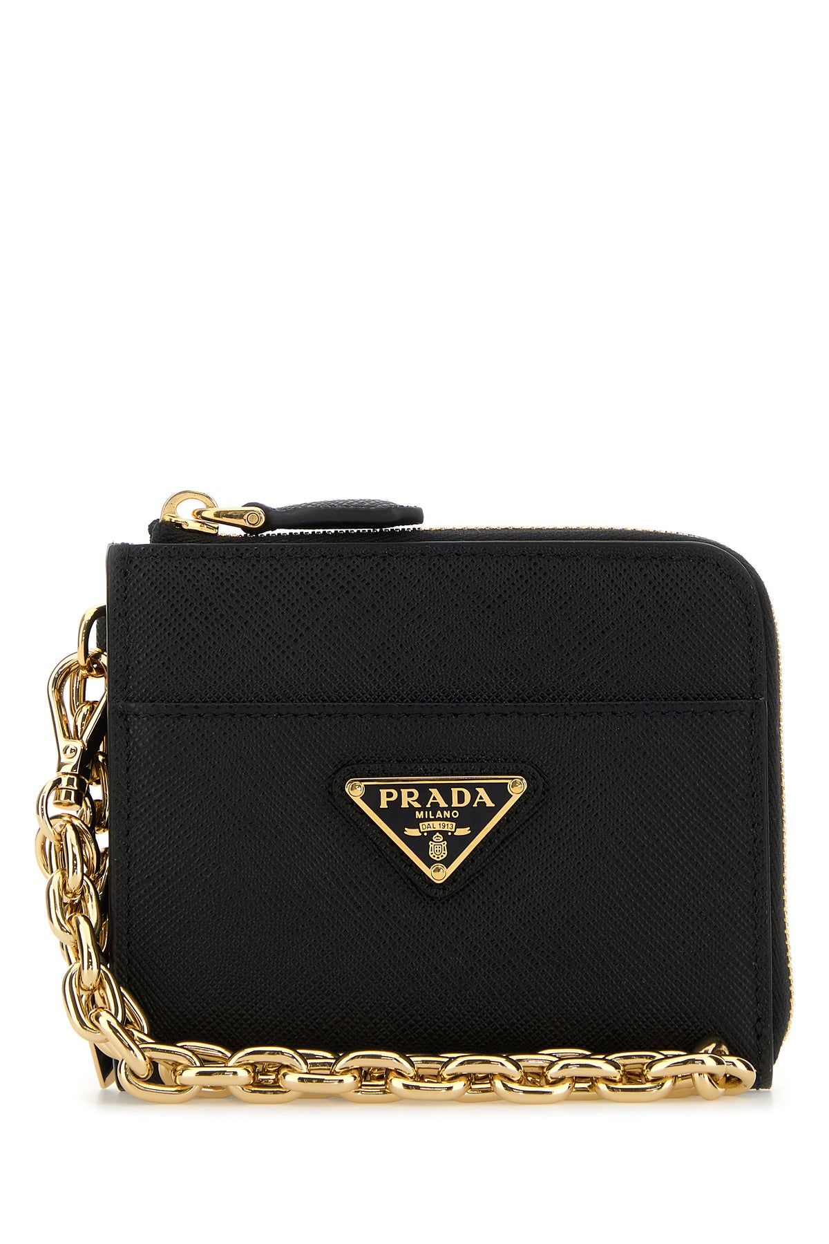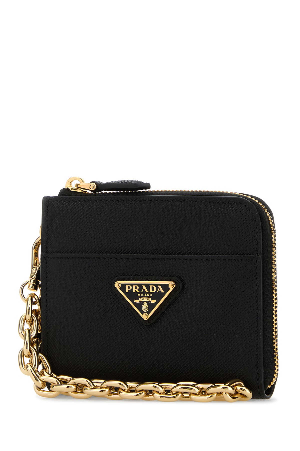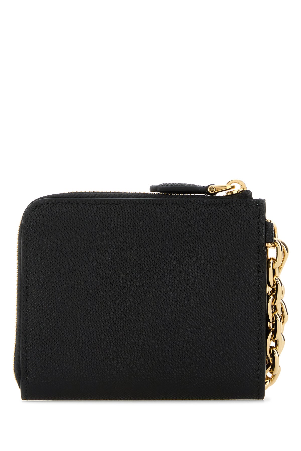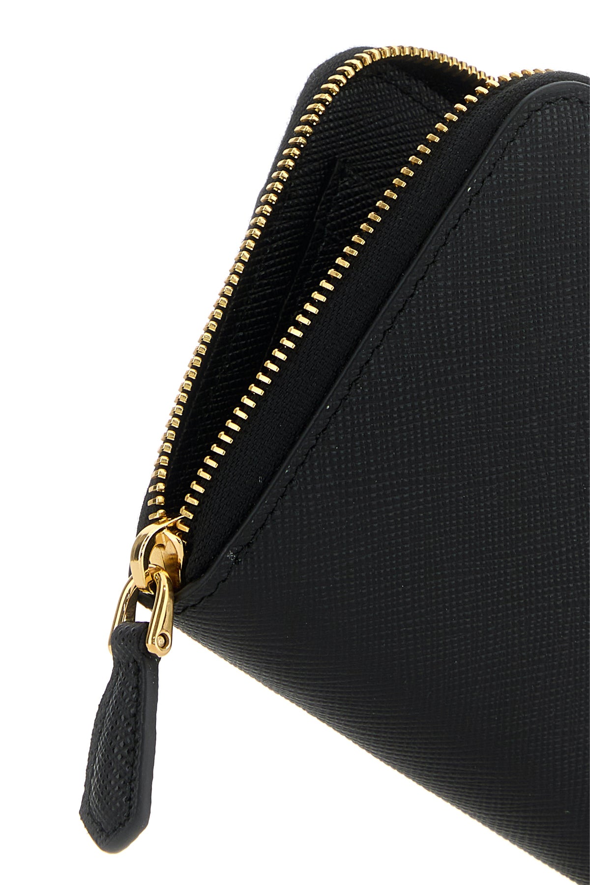 Portafoglio realizzato in pelle Saffiano arricchito da iconico triangolo logato in metallo sulla parte frontale.