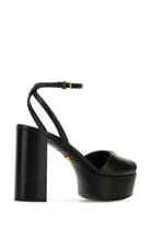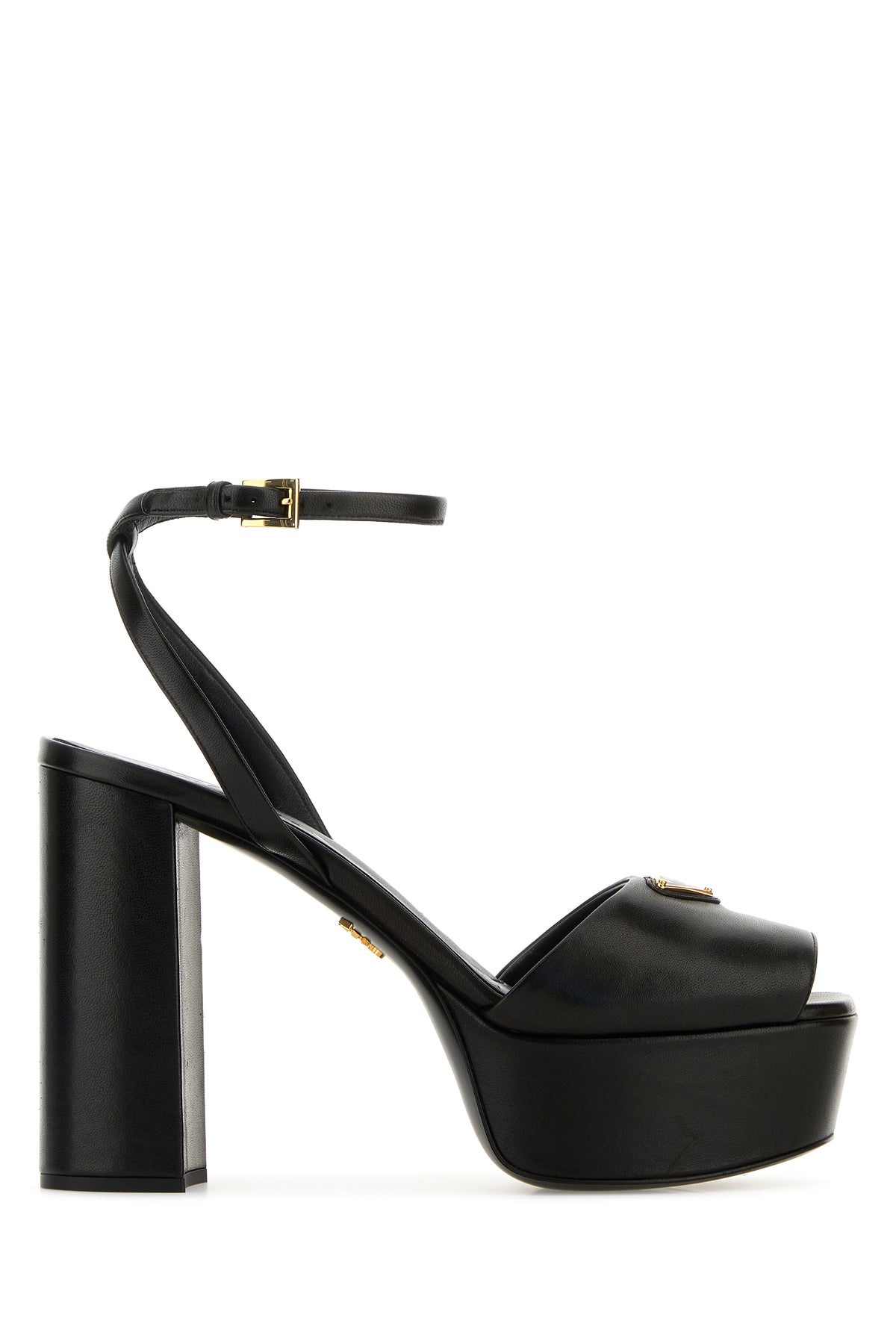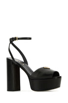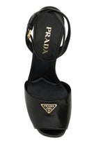 Sandali realizzati in nappa arricchita da iconico triangolo metallico logato sul collo del piede.