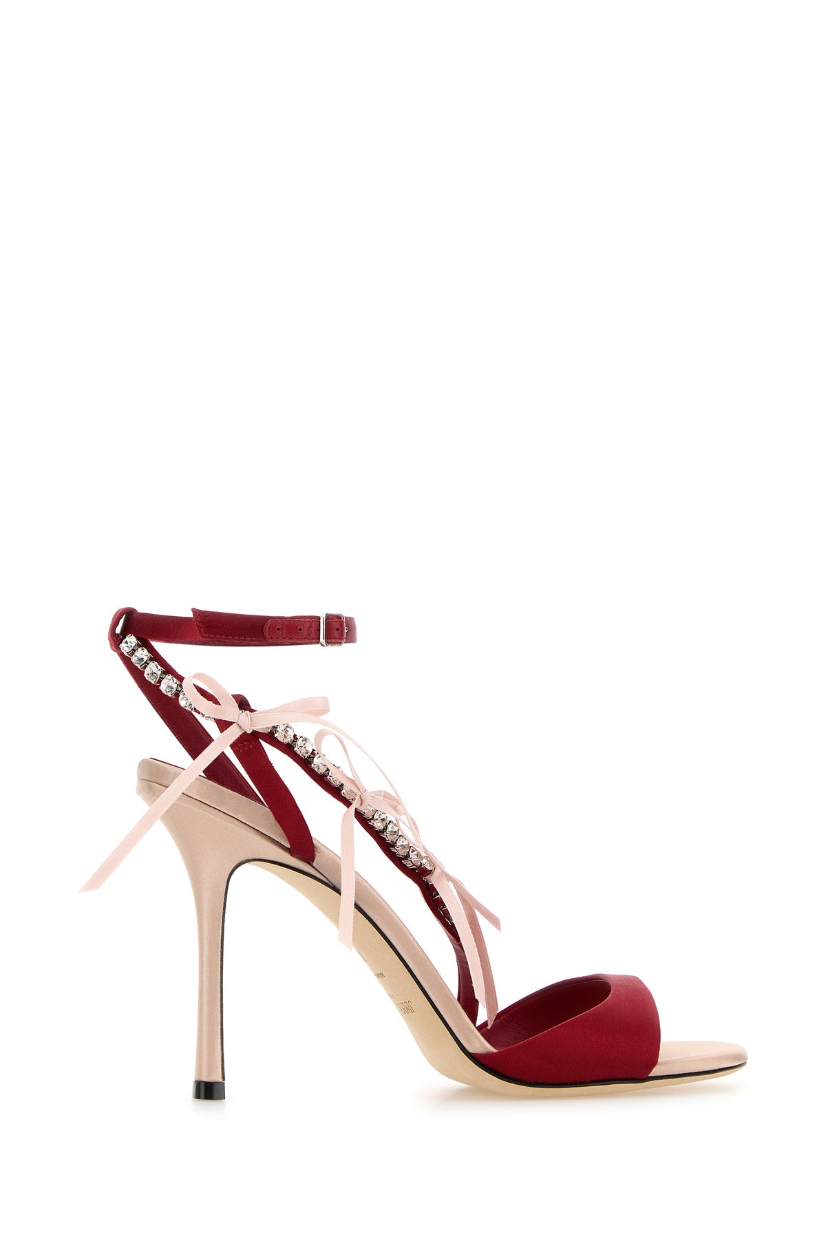 Sandali realizzati in raso arricchiti da cinturino gioiello sul collo del piede.
