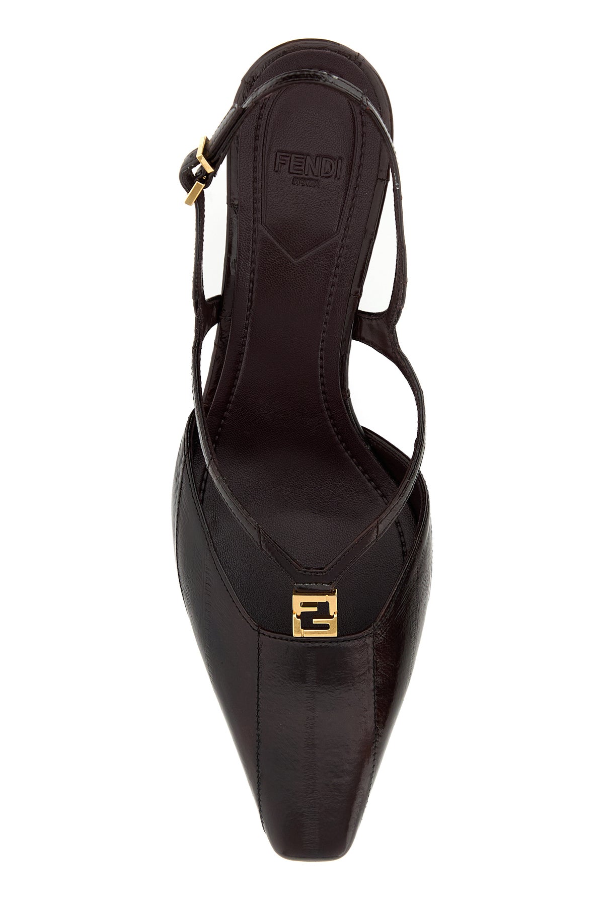 Slingback realizzate in pelle di anguilla arricchite da dettaglio metallico FF sul collo del piede.