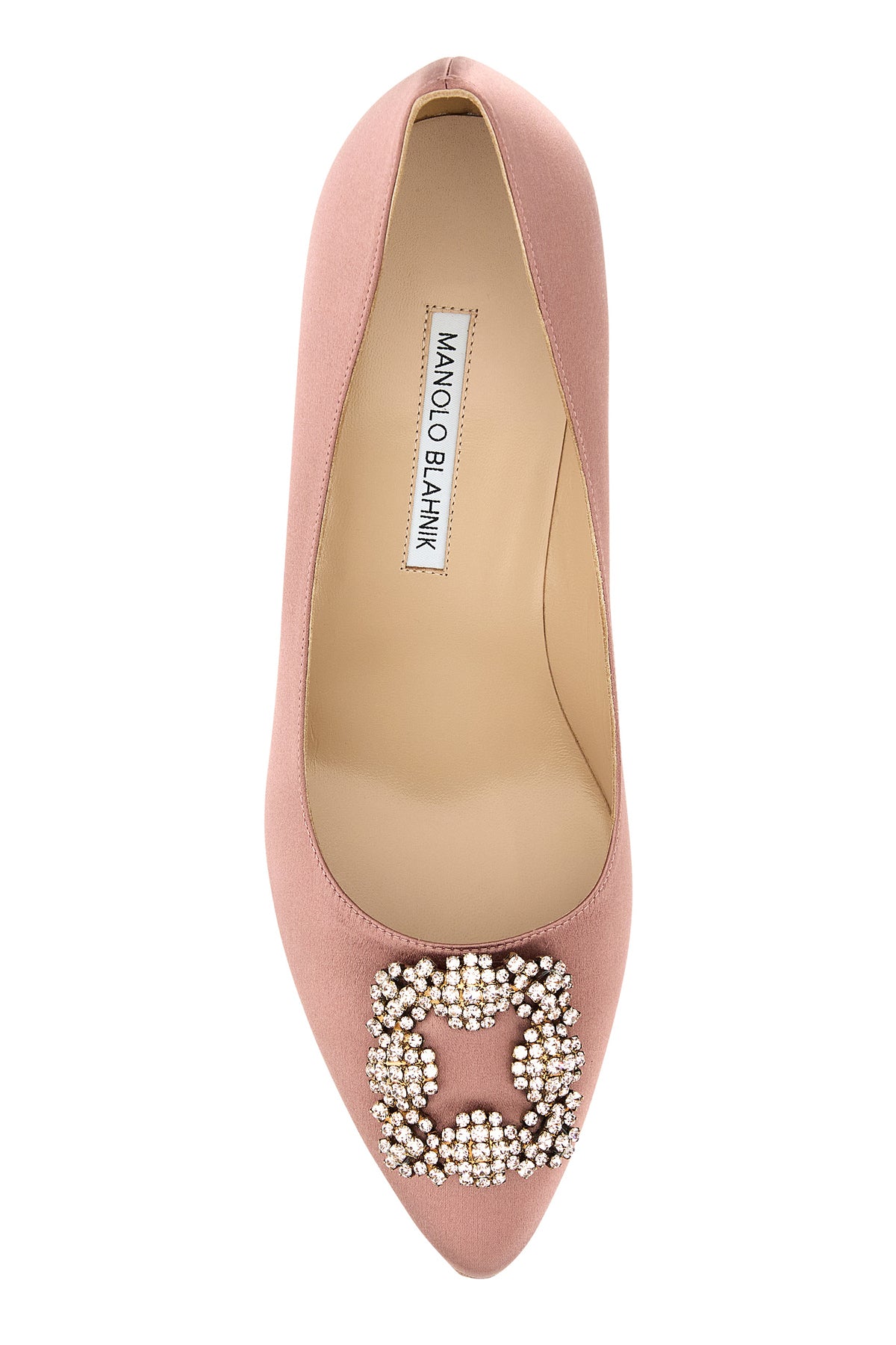 Scarpe con tacco realizzate in raso arricchite da decorazione gioiello sul collo del piede.