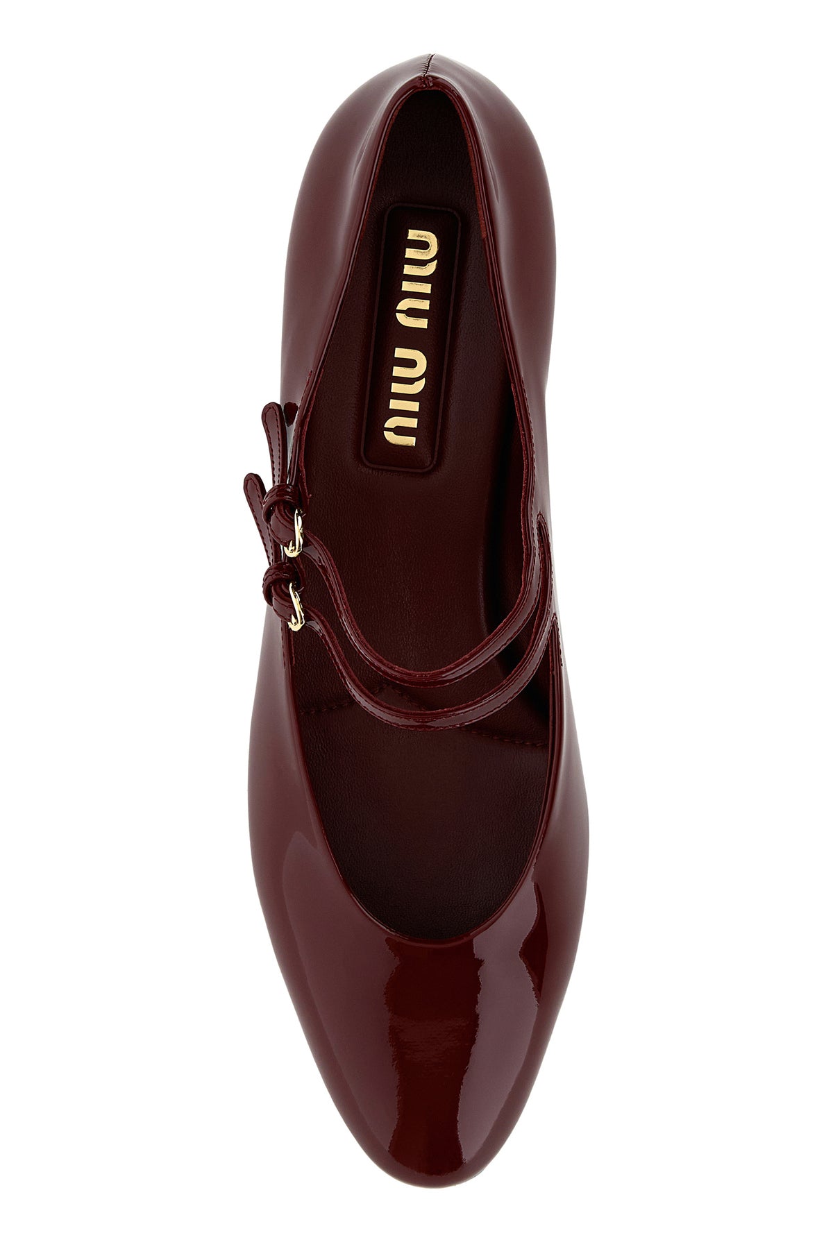 Scarpe con tacco realizzate in pelle verniciata arricchite da logo in lettere metalliche sul tacco spesso.
