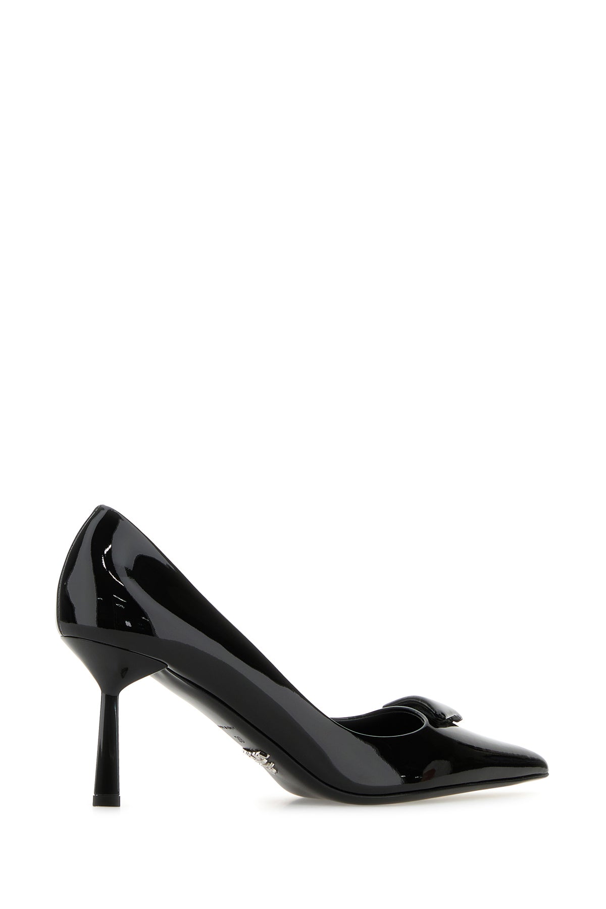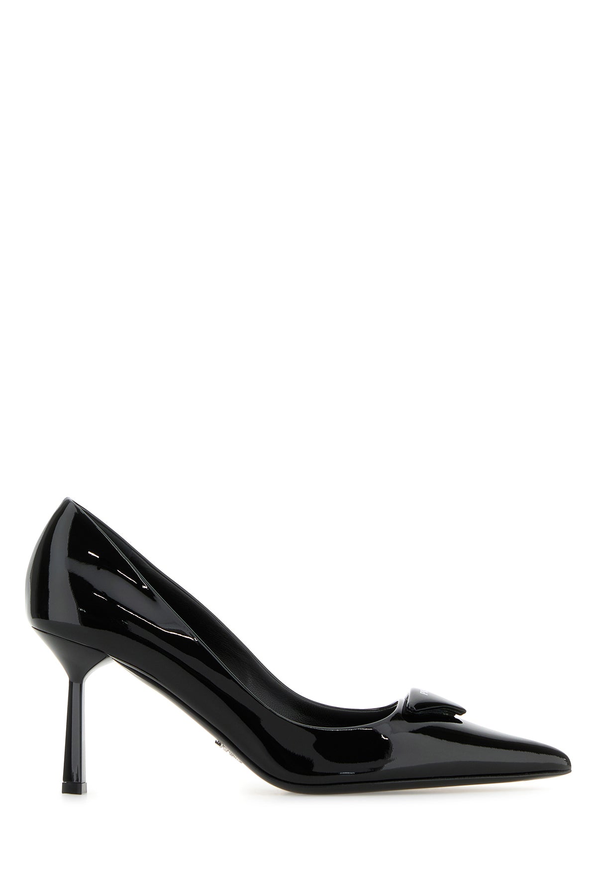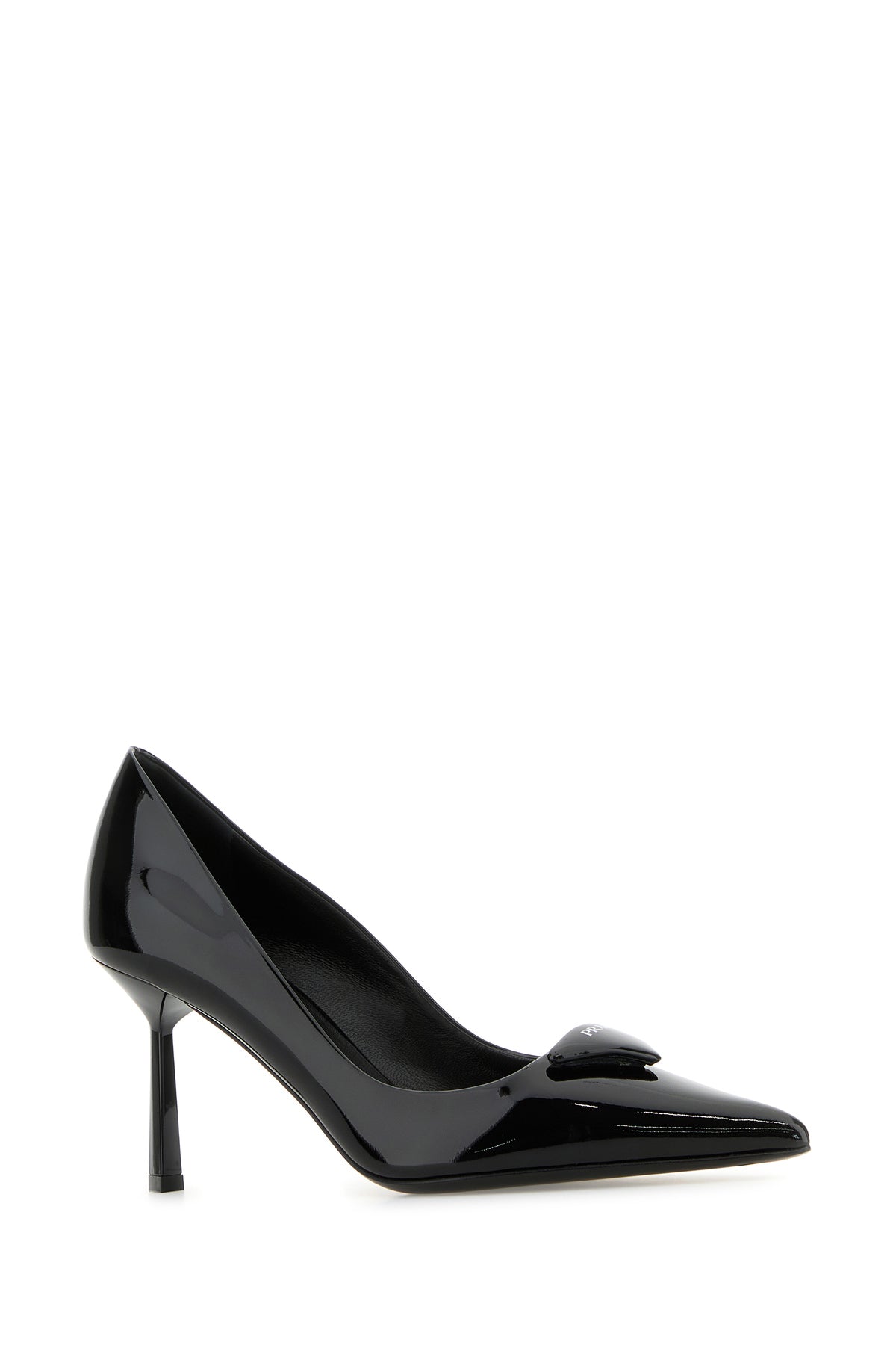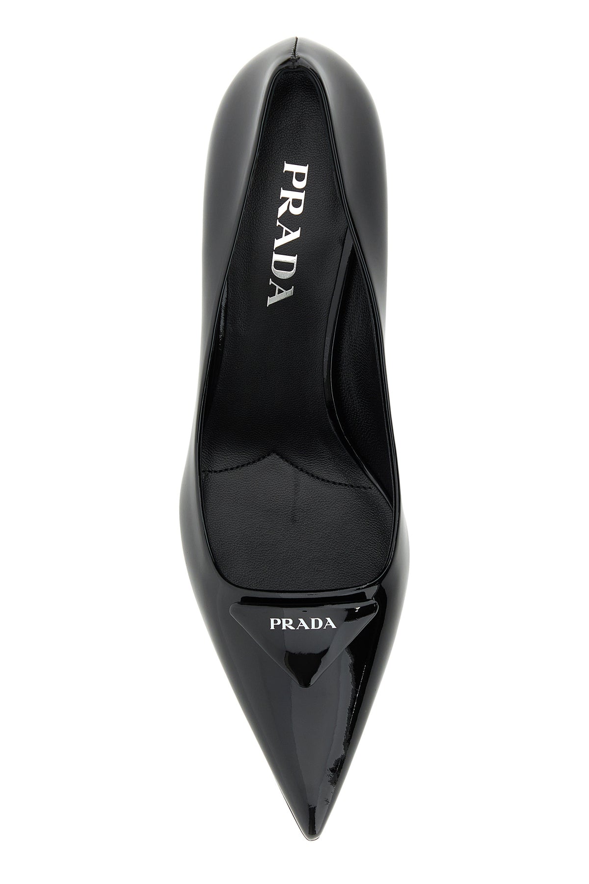 Scarpe con tacco realizzate in pelle verniciata arricchite da iconico triangolo logato sul collo del piede.