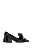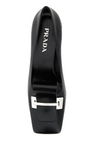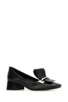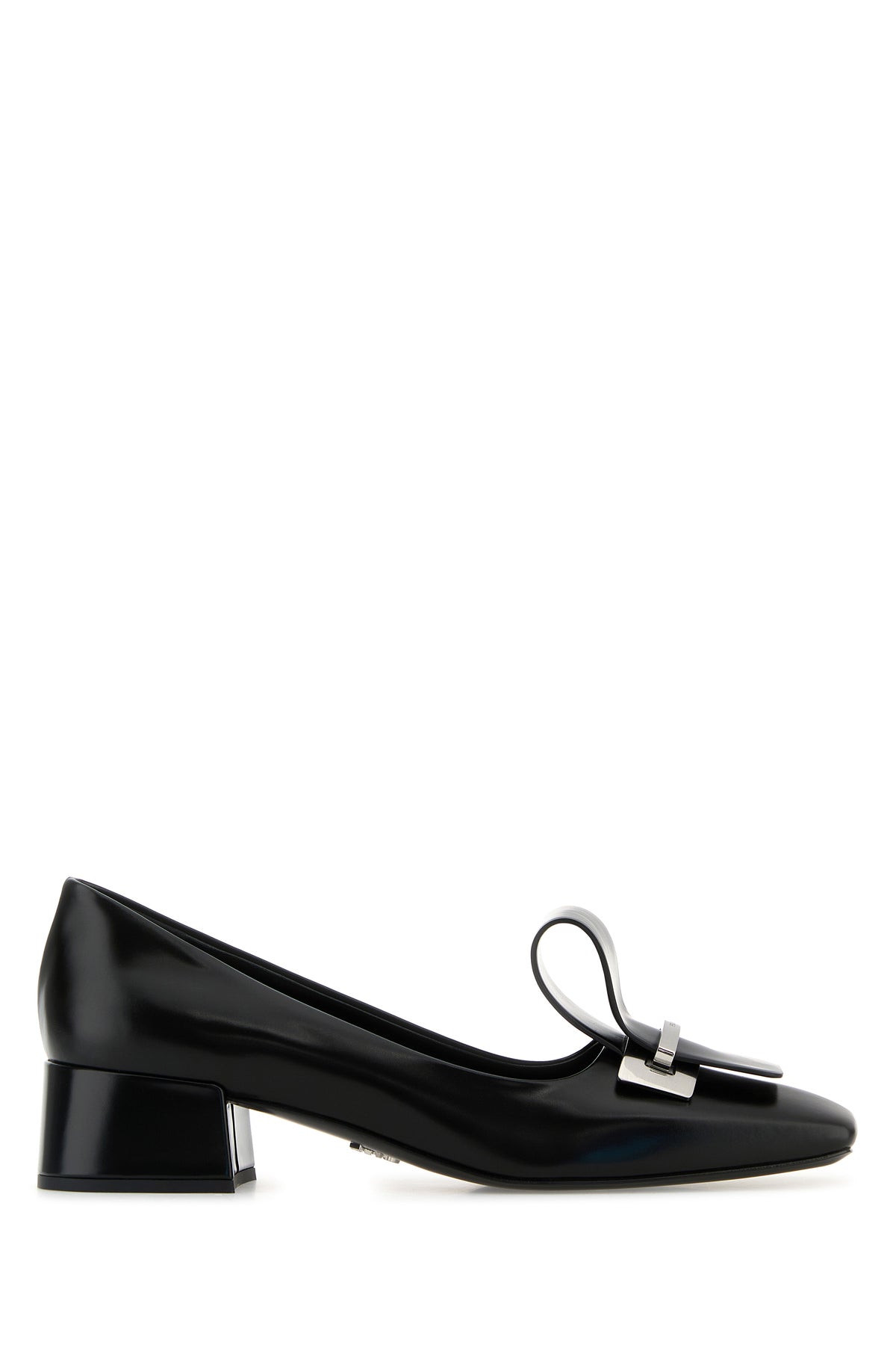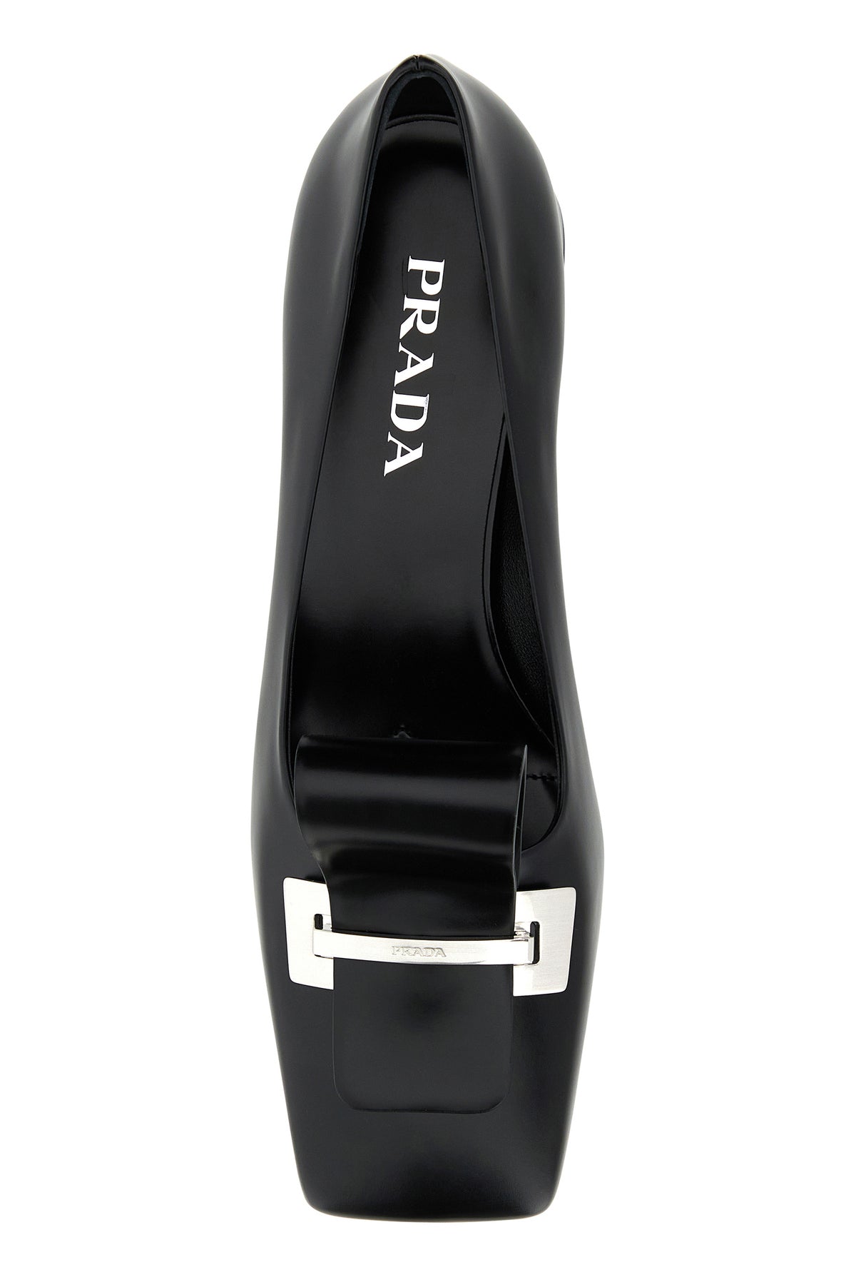 Scarpe con tacco realizzate in pelle arricchite da targhetta metallica logata sul collo del piede.