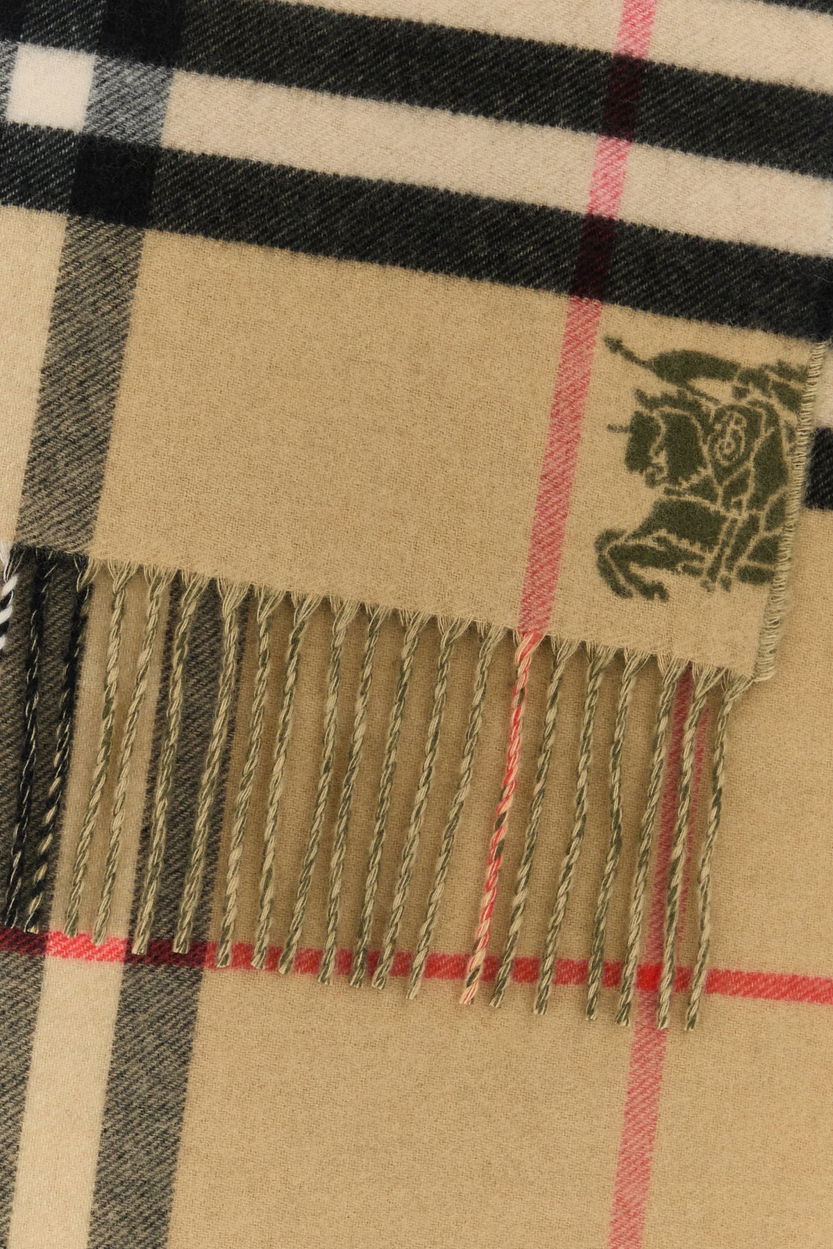 Sciarpa realizzata in puro cashmere caratterizzata da ricamo Burberry Check su tutta la superficie e ricamo Equestrian Knight sul fondo.