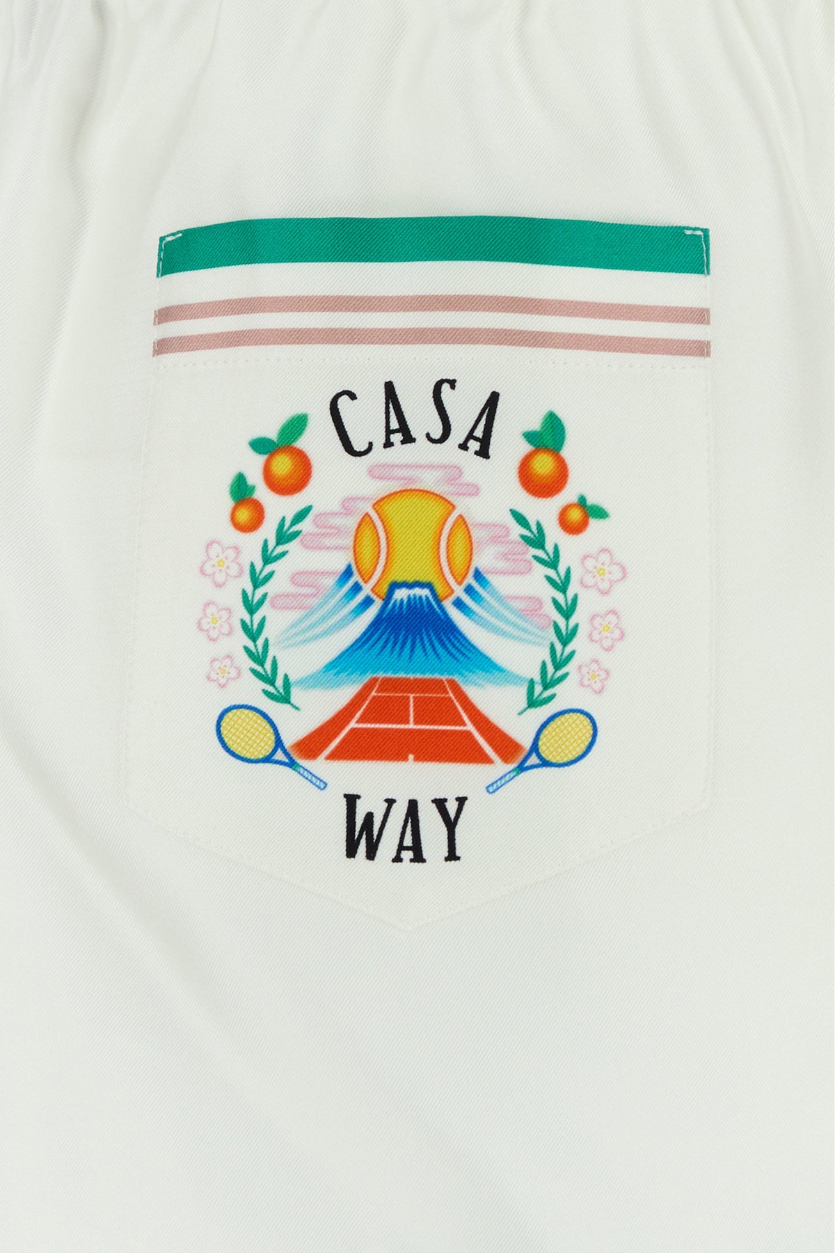 Shorts realizzati in raso di pura seta caratterizzati da stampa Casa Way sul retro e bande a contrasto sul fondo.