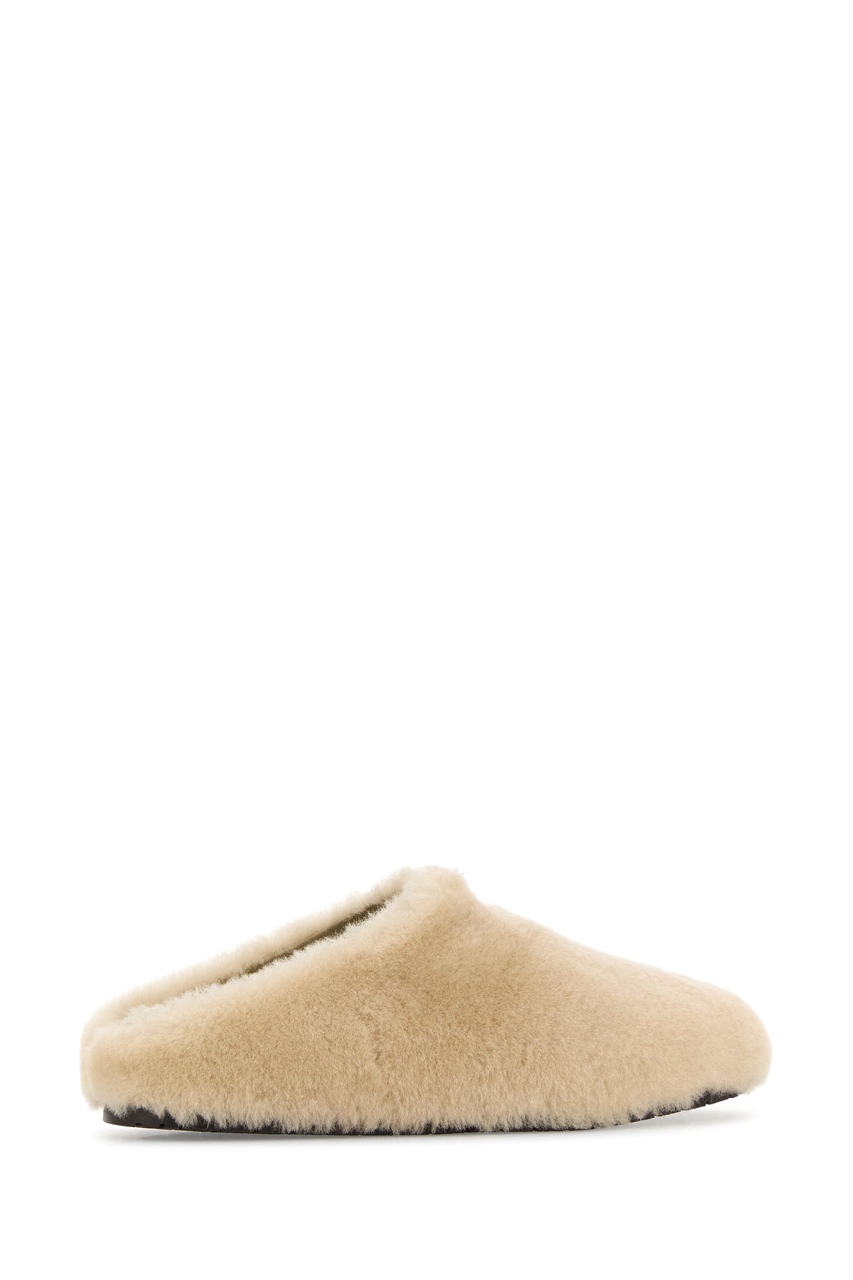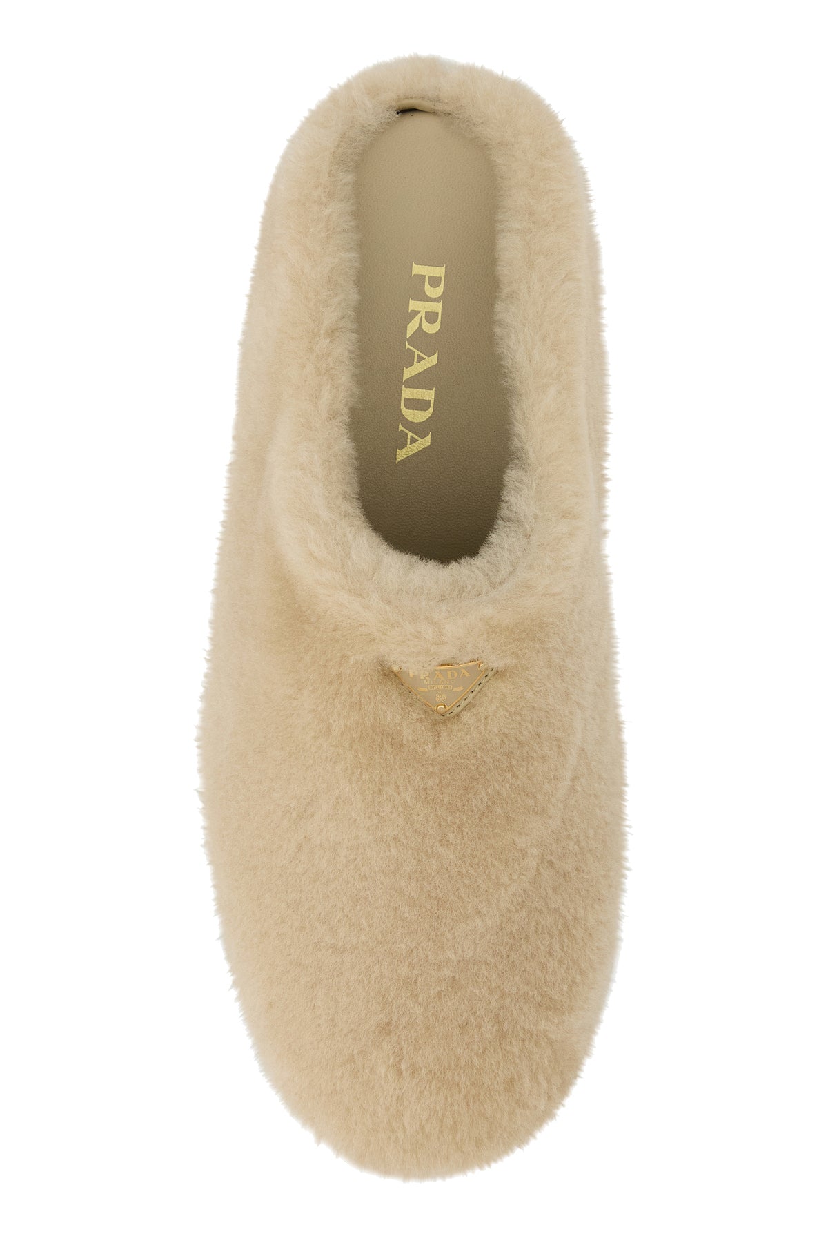 Slippers realizzate in montone arricchite da iconico triangolo metallico logato sul collo del piede.