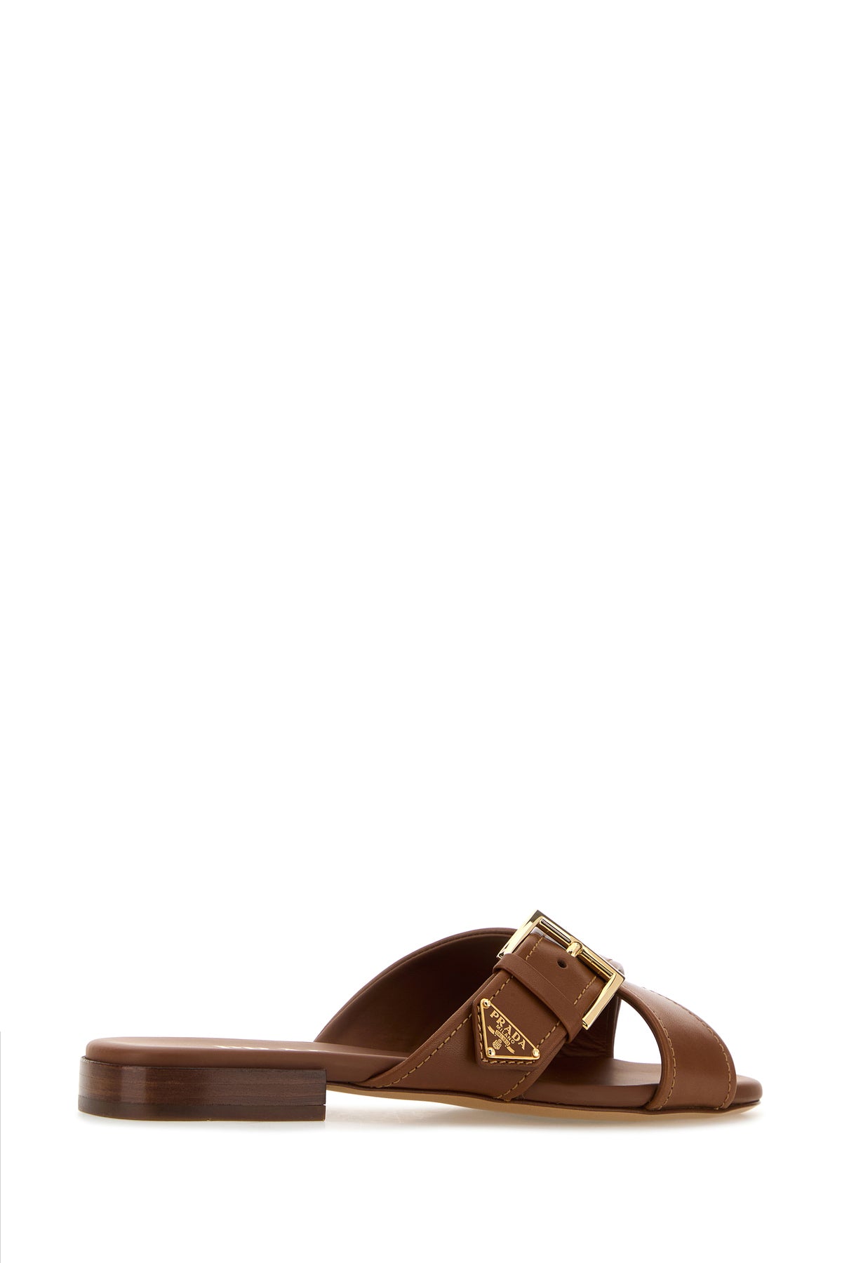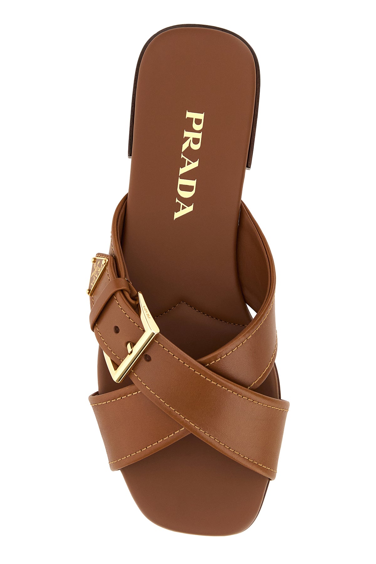 Slippers realizzate in pelle arricchite da iconico triangolo metallico logato sul lato.