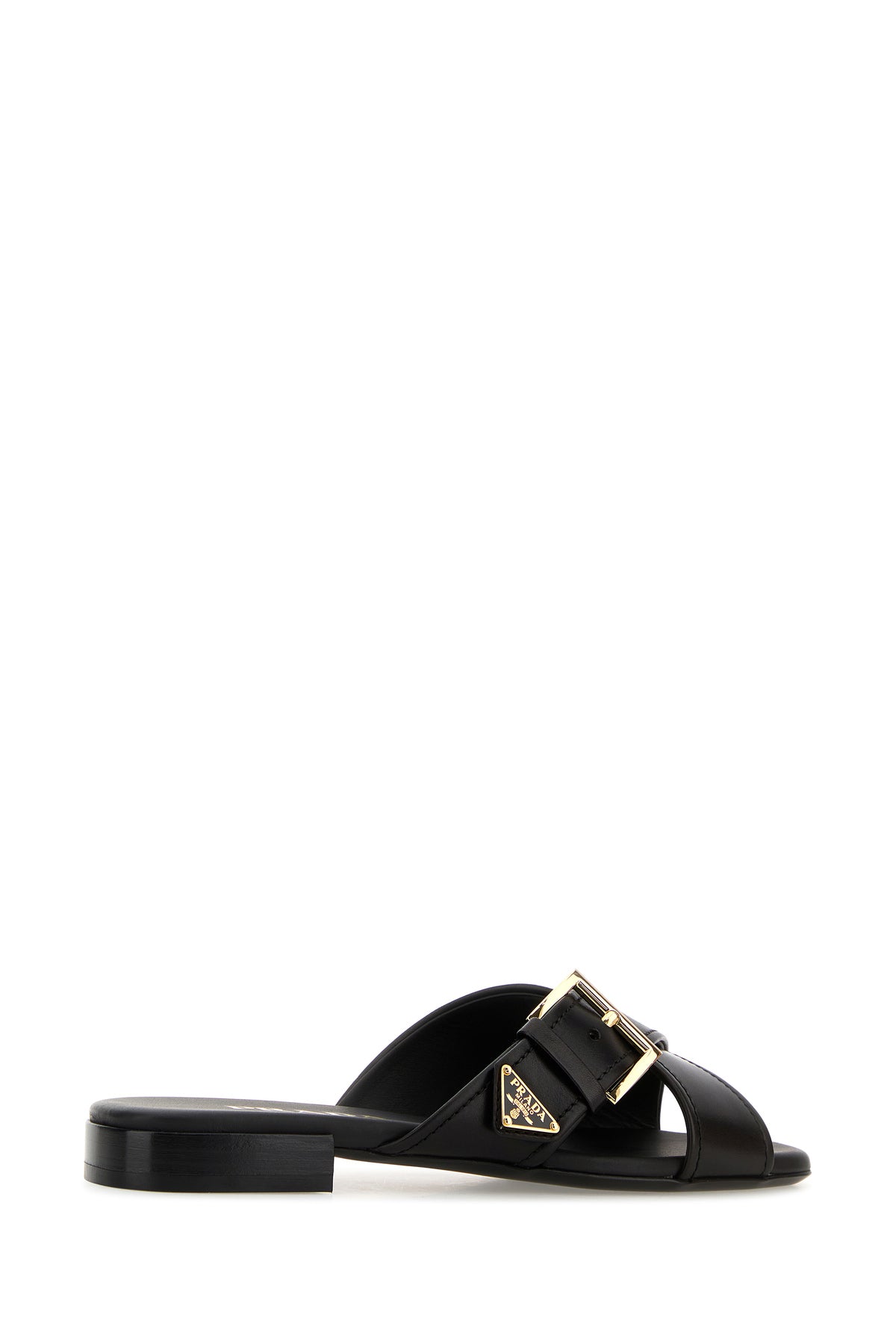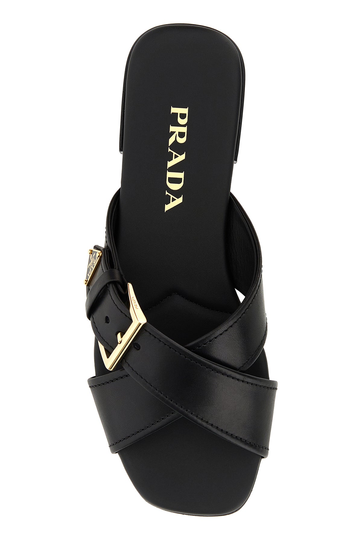 Slippers realizzate in pelle arricchite da iconico triangolo metallico logato sul lato.